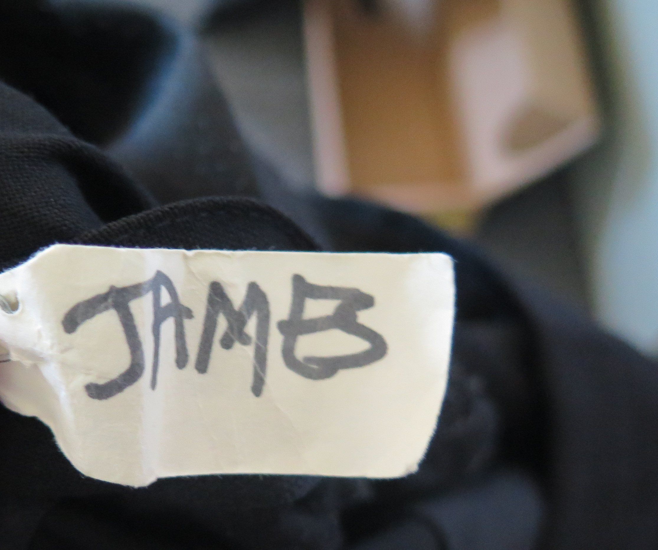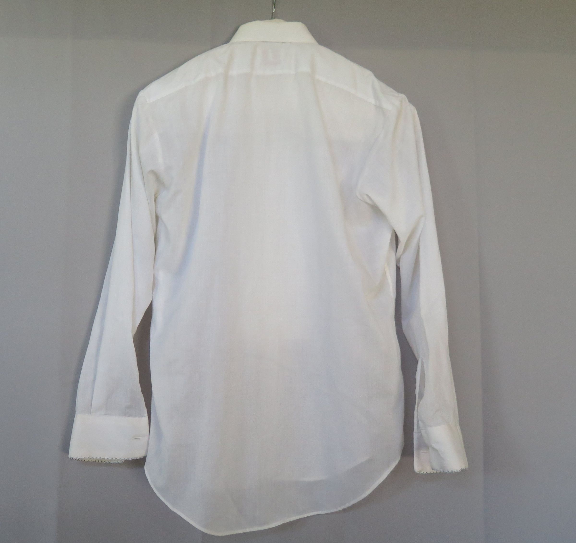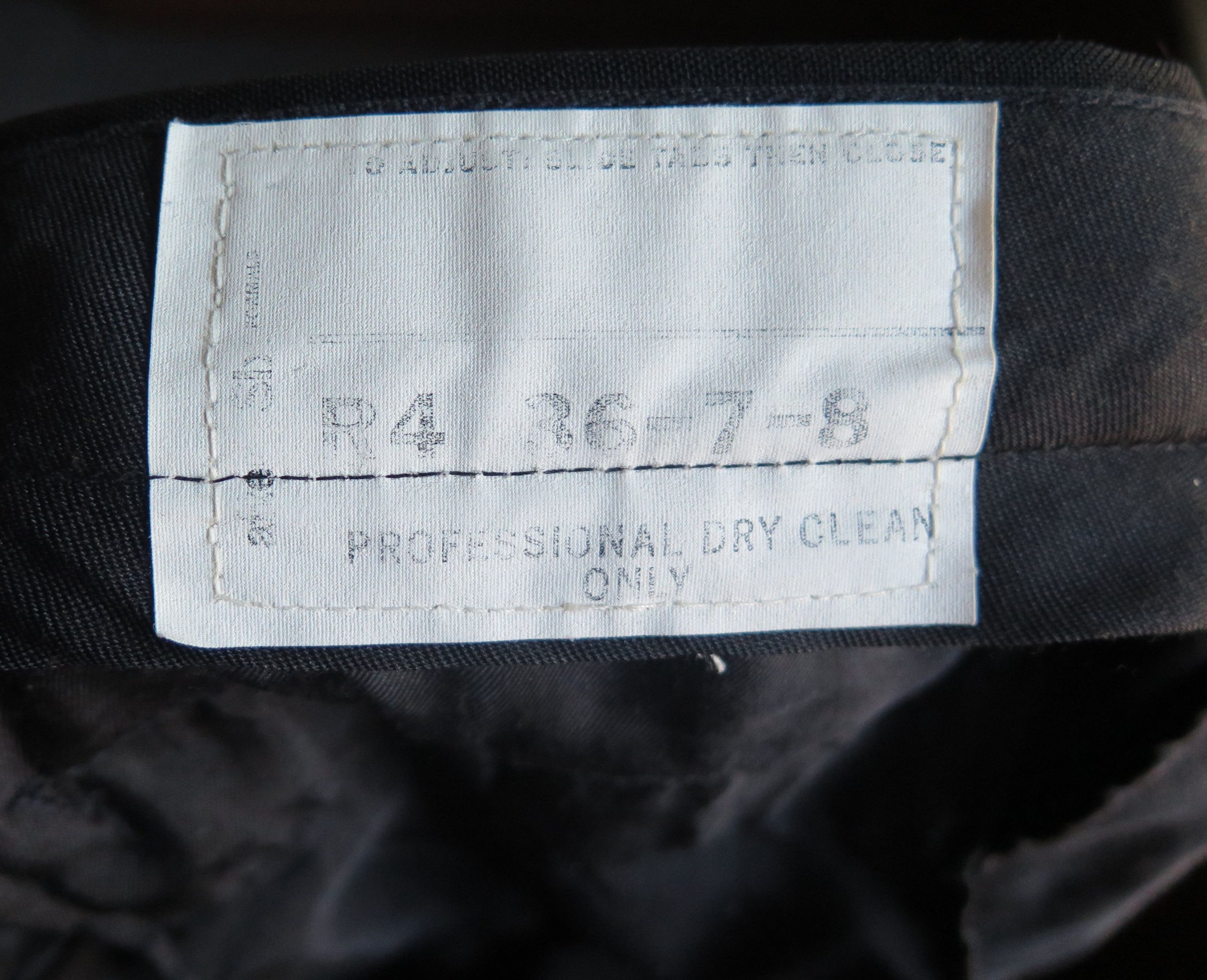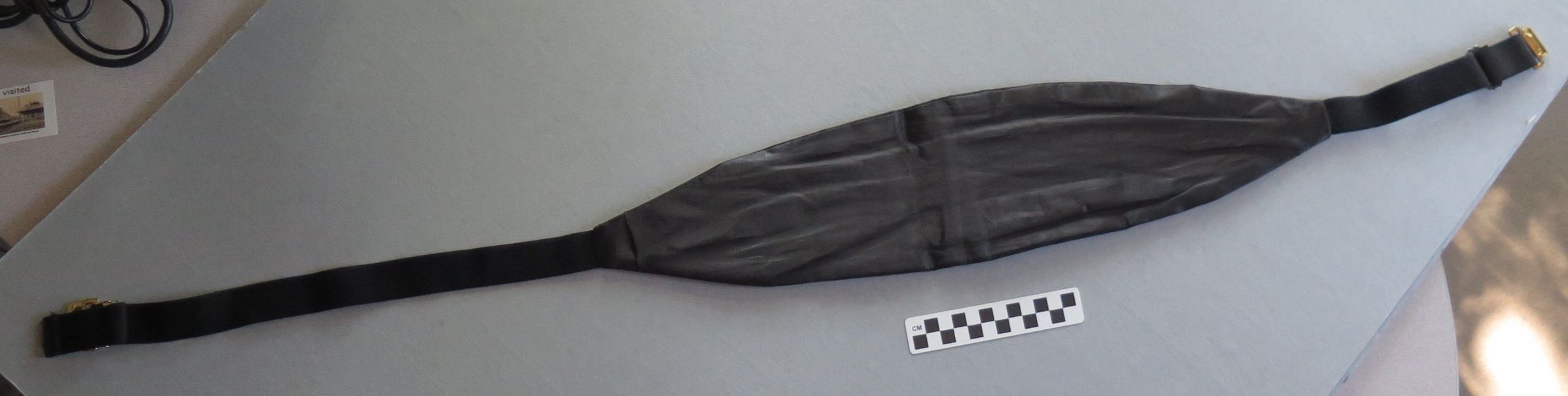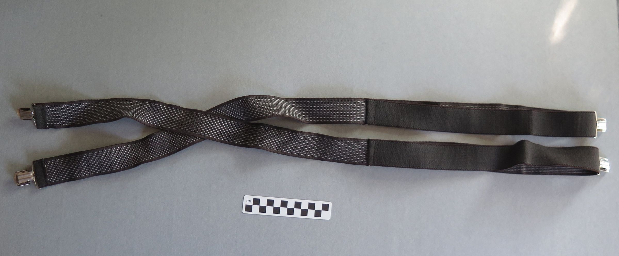 Black tuxedo jacket (a) from a tuxedo rental. The jacket is a single button peak lapel with a center vent. There is one button on each sleeve. The tag on the inside explains it is a 46Regular from the company After Six Formals, circa 1970-80s. Black tuxedo pants (b), from a rental tuxedo. The pants are three size adjustable: waist sizes 36-37-38. Inside the pants is a handwritten tag which reads "James." The shirt (c) is a button up tuxedo shirt with a point collar and white ruffles on the front trimmed in with black edging. The sleeves are a French cuff with black trim along the scalloped edges. The tag inside the shirt reads "After Six 16.5 34-35 65% polyester - 35% cotton." Black cummerbund (d) with gold clip in the back. Brown suspenders (e) with white stripes. The black bow tie (f) is a clip on with s cinch in the back to change size. The jacket (a) measures 33" (w) x 48" (l), the pants (b) measures 24.5" (w) x 40.5" (l), the shirt (c) measures 16.5" (w) x 34" (l), the cummerbund (d) measures 5" (w) x 42" (l), the suspenders (e) measure 5" (w) x 38" (l), the bow tie measure 2" (w) x 18" (l).