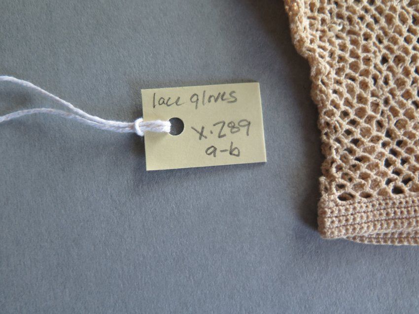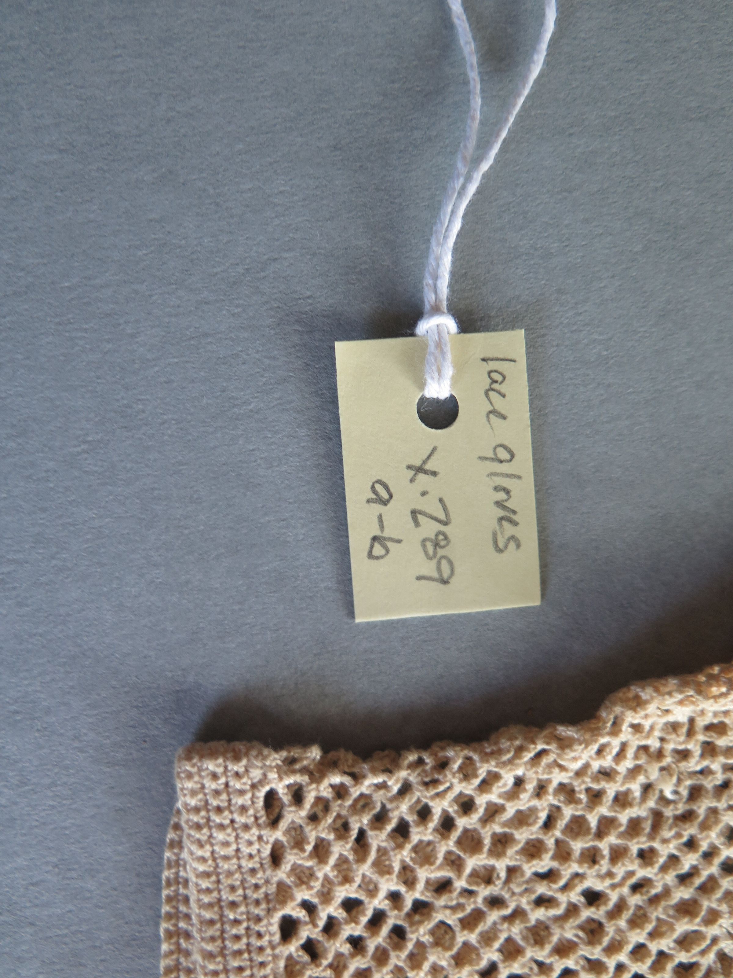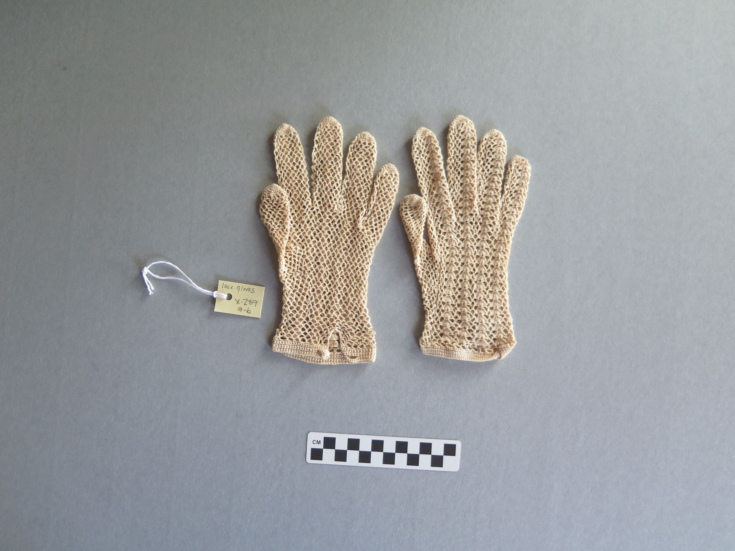 Off-white knitted wrist length gloves with small opens at the wrist. The gloves measure 5" (w) x 8" (l).