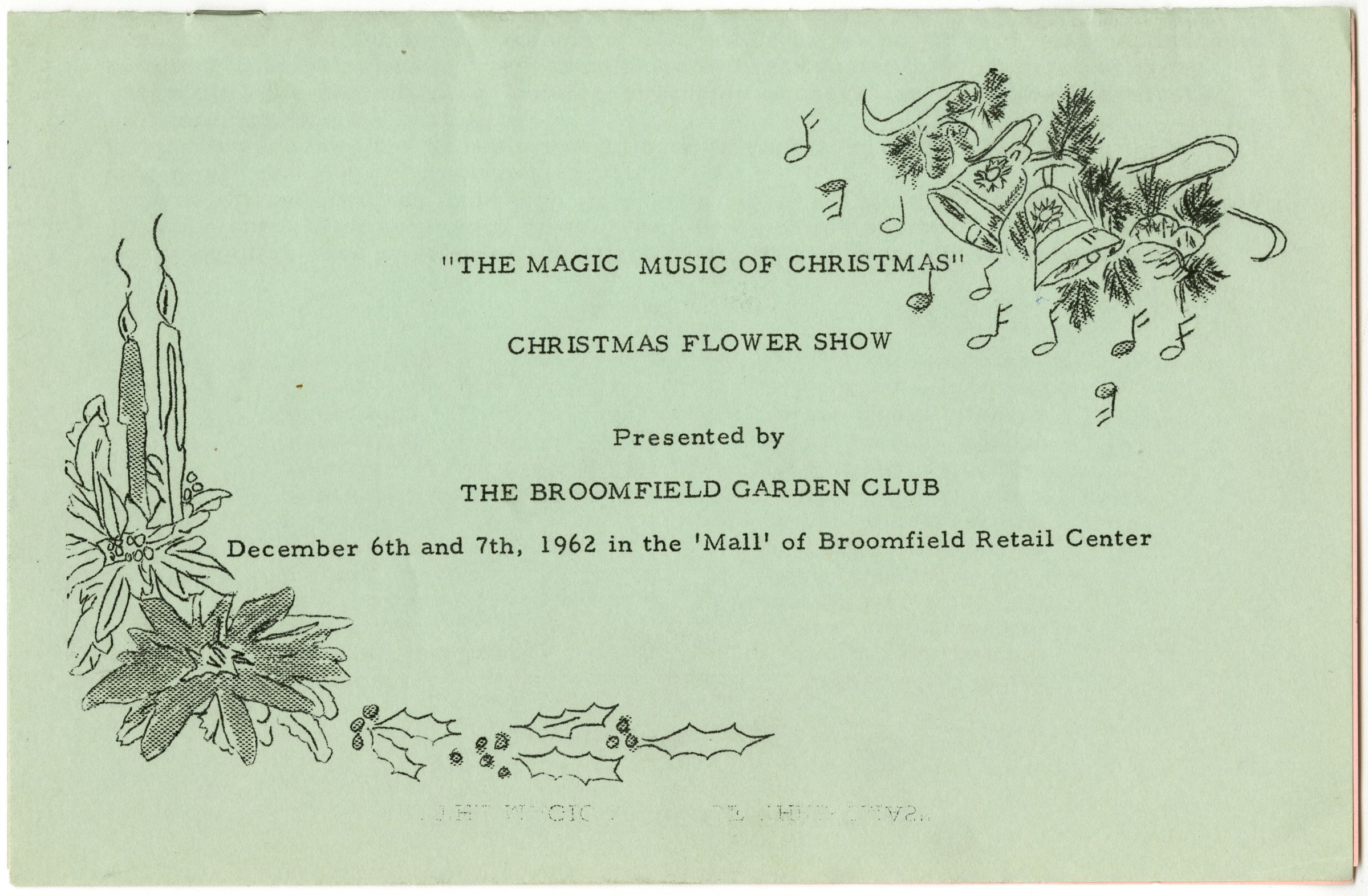 Program for "The Magic Music of Christmas" Christmas Flower SHow Presented by the Broomfield Garden Club, December 6th and 7th. 1962 in the 'Mall' of Broomfield Retail Center.