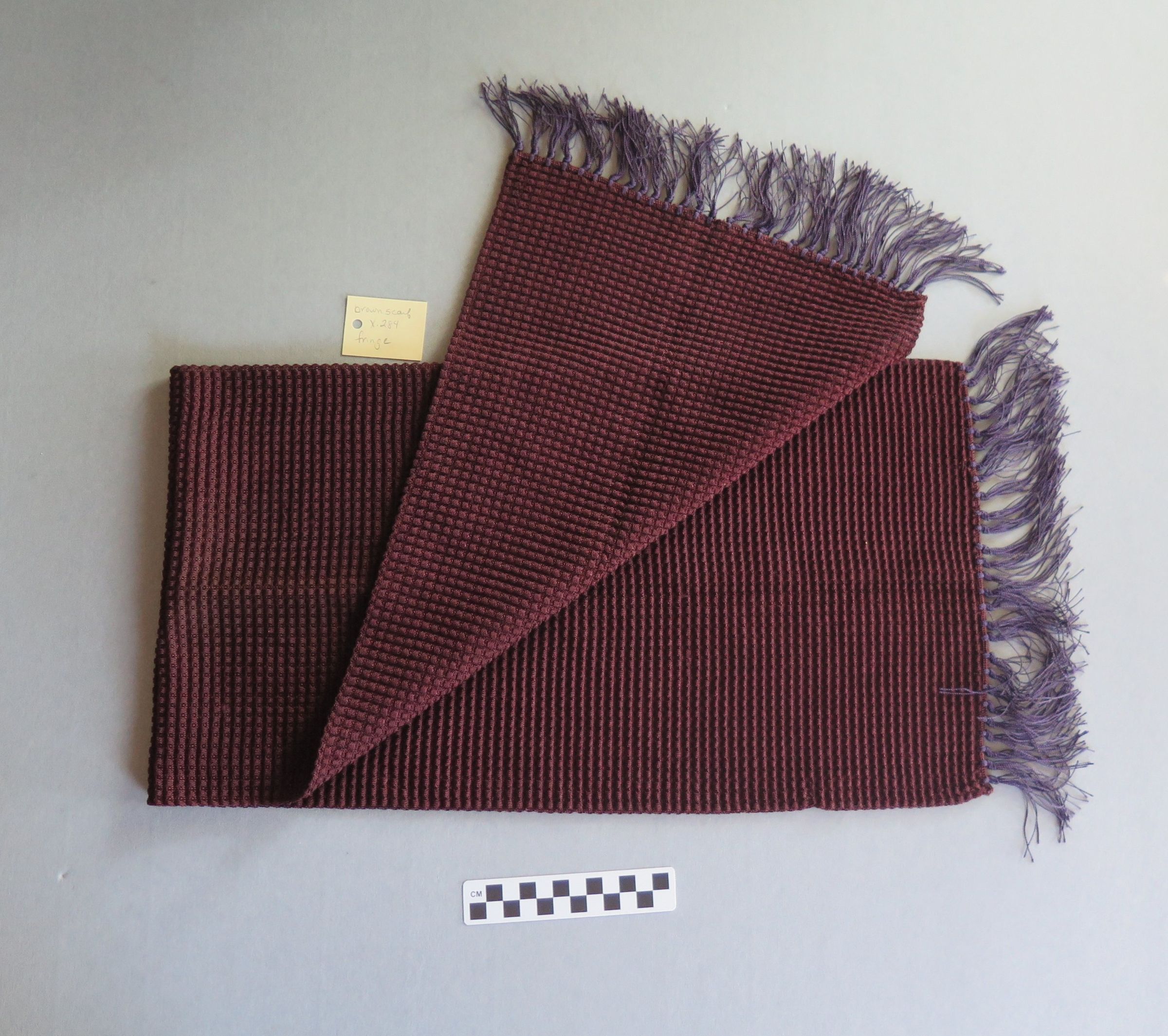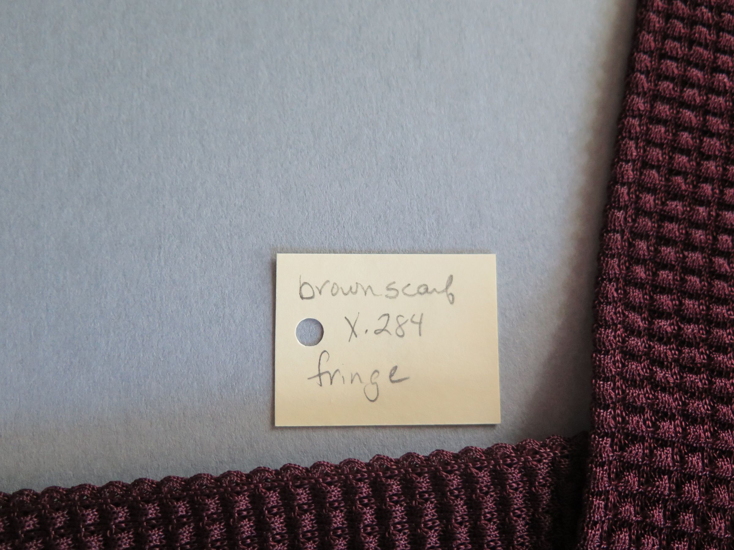 Brown or maroon knitted scarf with fringe on the ends. The scarf measures 11" (w) x 43" (l).