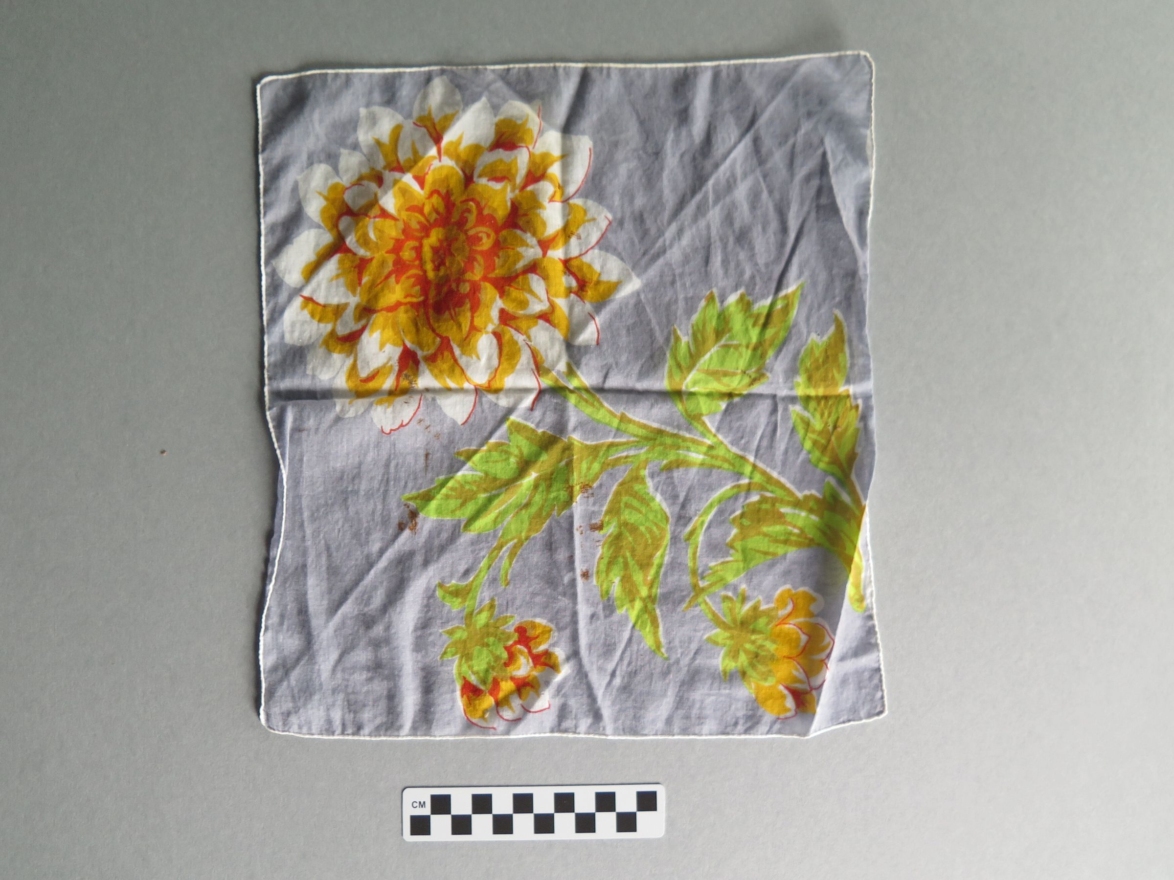 Blue or purple handkerchief with a large open orange flower in one corner. The flower comes off a stem that is green and has smaller closed orange flowers growing off of it. The handkerchief measures 13" (w) x 13" (l).