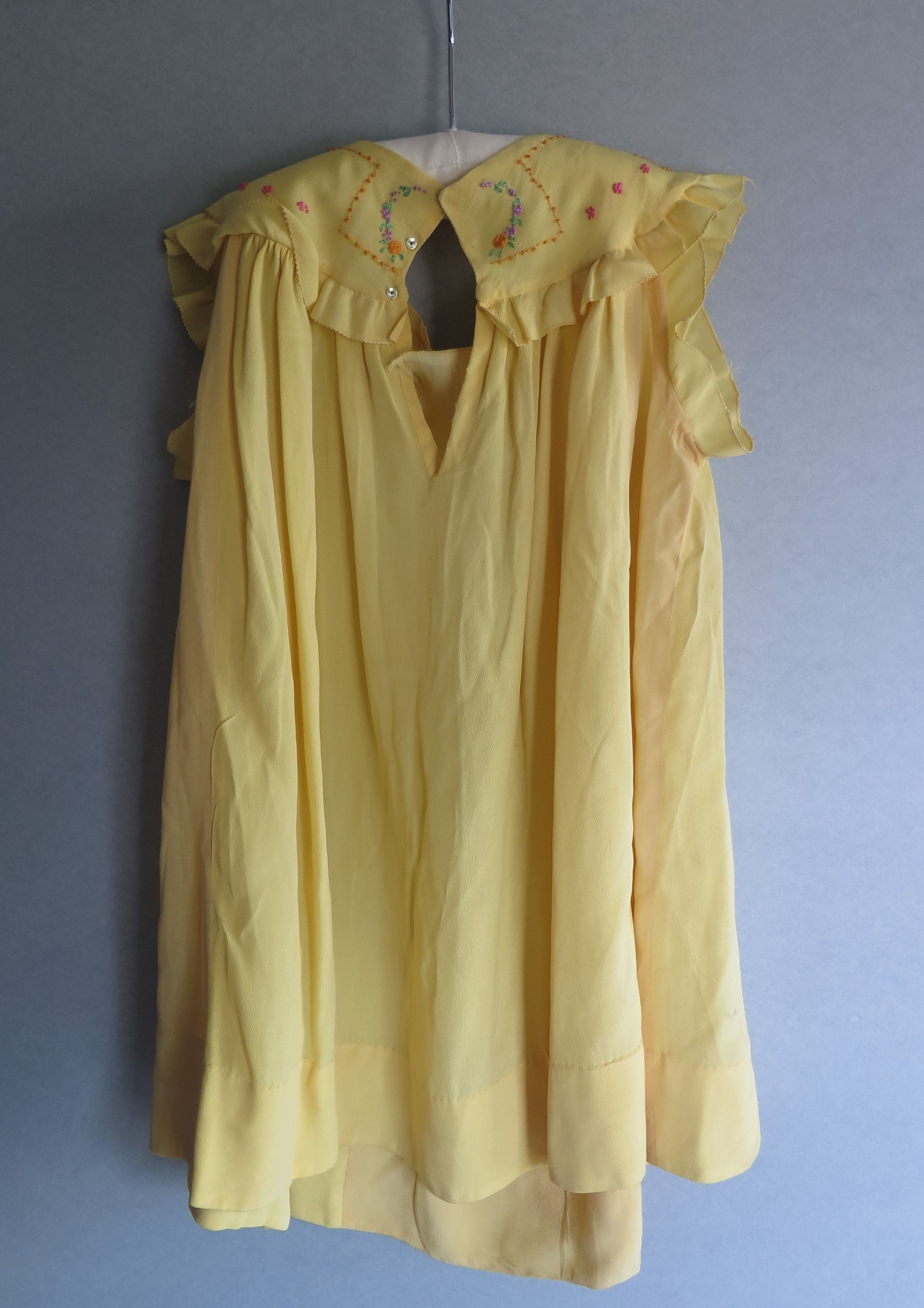 Yellow sleeveless child's dress with green wreaths with pink bows around the neckline. There are ruffles made of the same material as the dress around the neck and the arm holes. There is one wreath near the bottom of the dress. The back of the dress splits at the top and has buttons that run about 1/4 of the way down to close the dress. The dress measures 9" (w) x 18" (l).
