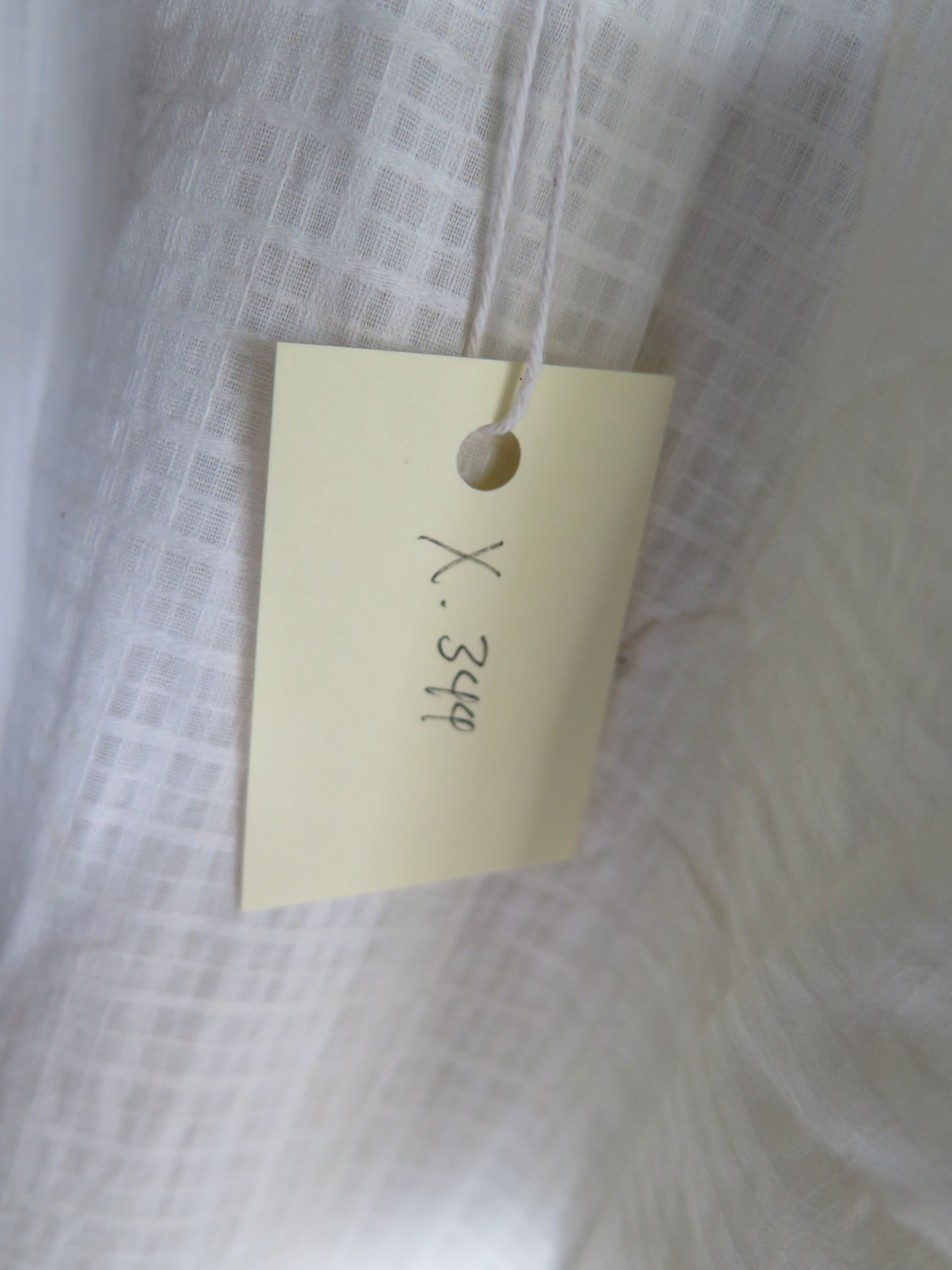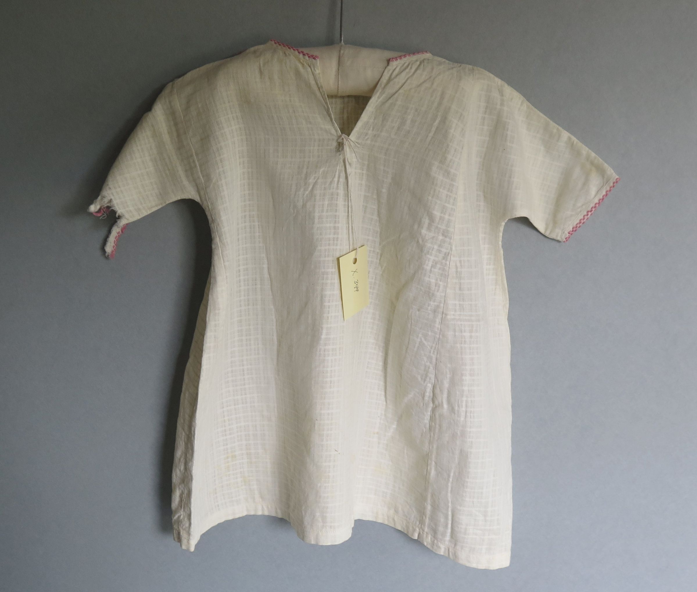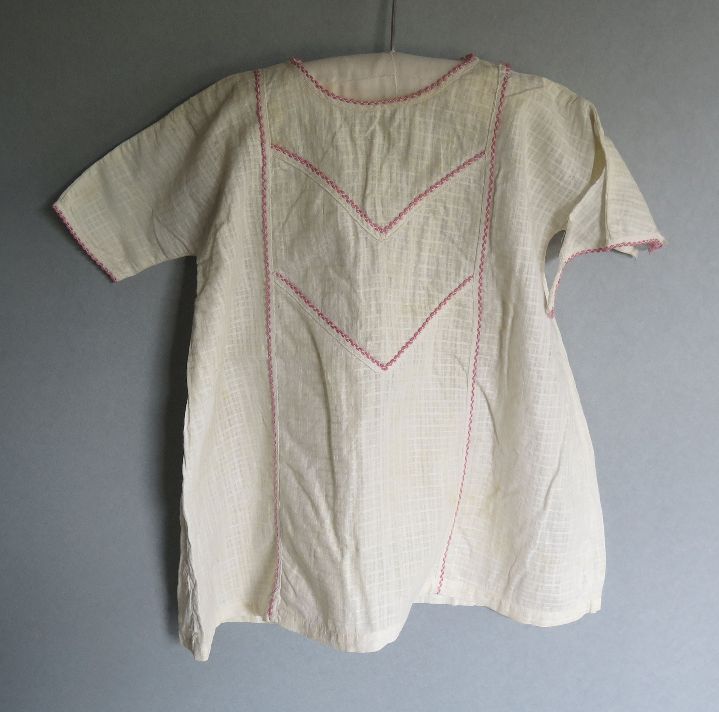 Child's white dress with a tone on tone plaid pattern and pink trim on the neckline and hem of the sleeves. There is pink trim going down in two lines along the front the of the dress with two "v" shaped lines trimmed in pink connected the two vertical lines of pink. There is a slit in the back of the dress at the neckline to close the dress. One of the sleeves of the dress is torn. The dress measures 9" (w) x 17" (l).
