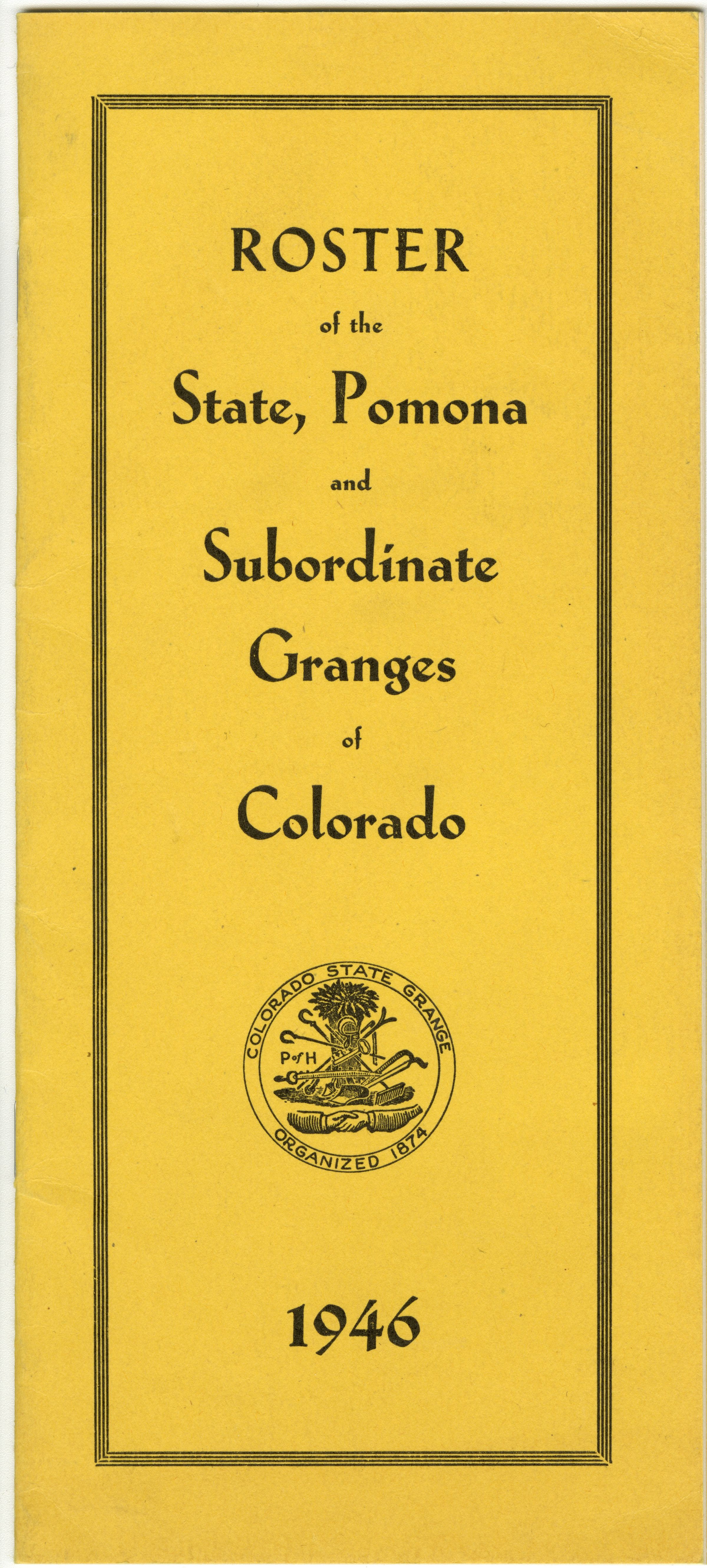 Roster of the State, Pomona, and Subordinate Granges of Colorado, 1946. Orange cover, Colorado State Grange seal on front.