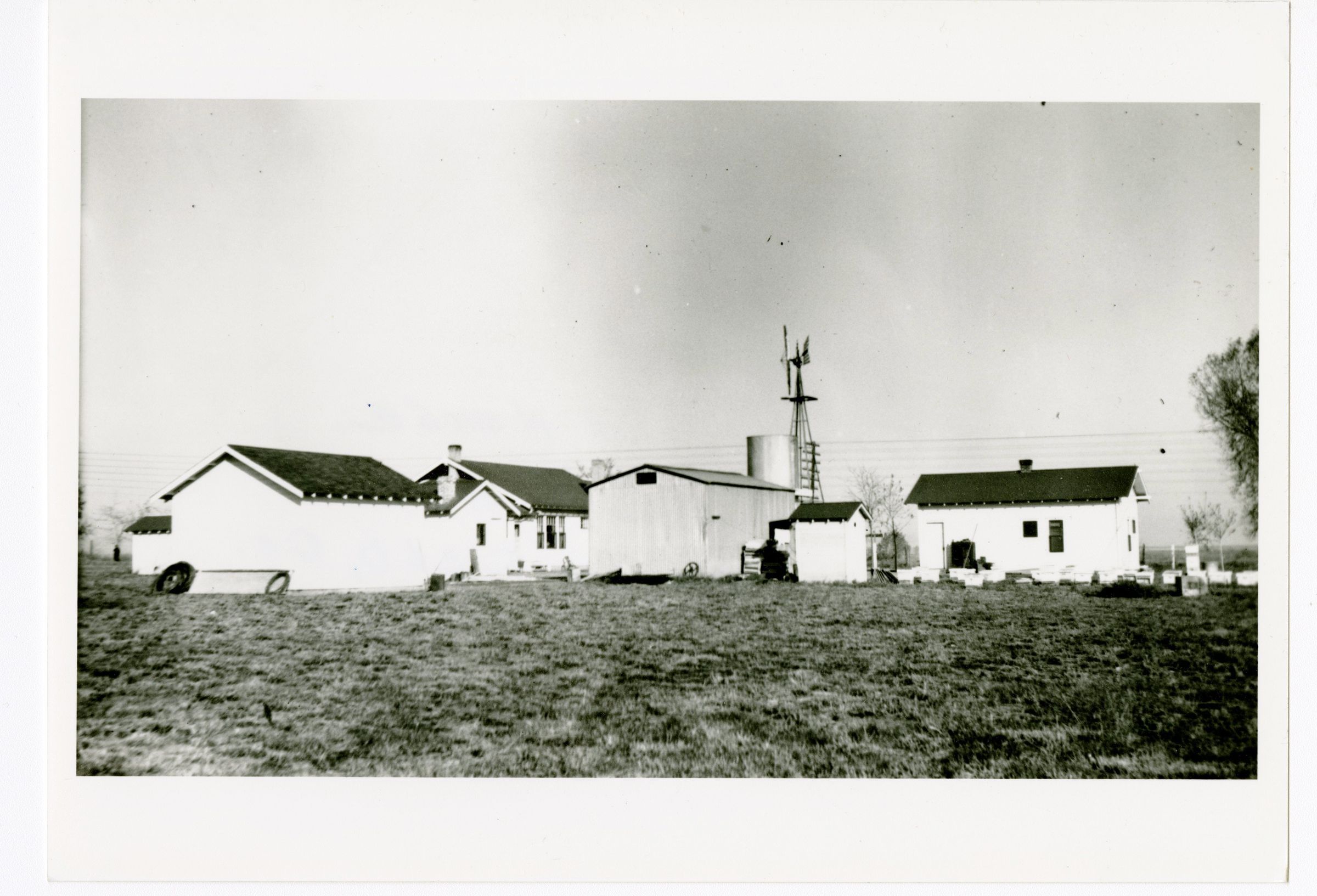 Black and white photograph of the Crawford Farm and Honey House located on 120th Ave. in Broomfield CO. The Honey House is the building at the far right. The image shows five buildings and a windmill.