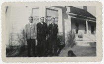 Black and white photograph of three men standing outside in front of a house. A bay window is visible behind the men. A porch is also visible in the background on the right side of the image. The two men on the right are wearing naval uniforms. From left to right the men are Gib Brunner, Dale Brunner, and Clyde Brunner. Photograph was taken at the Brunner Farmhouse likely in January of 1946.Photograph Details