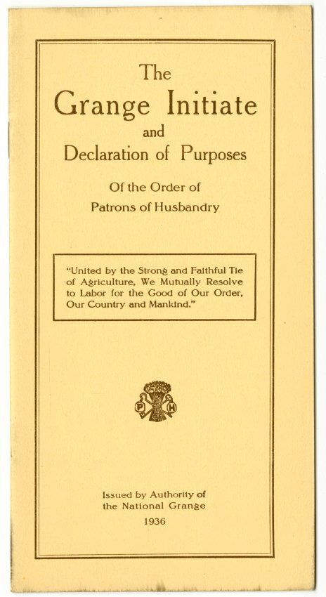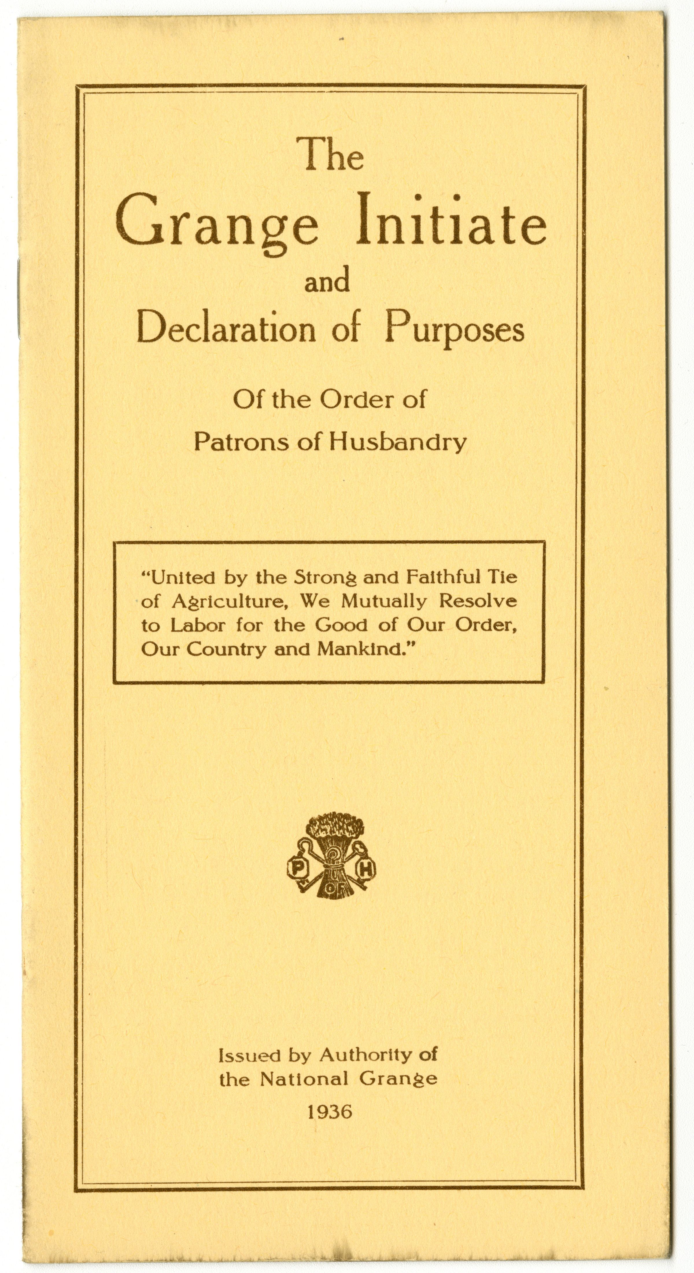 The Grange Initiate and Declaration of Purposes Of the Order of Patrons of Husbandry. Issued by Authority of the National Grage, 1936.