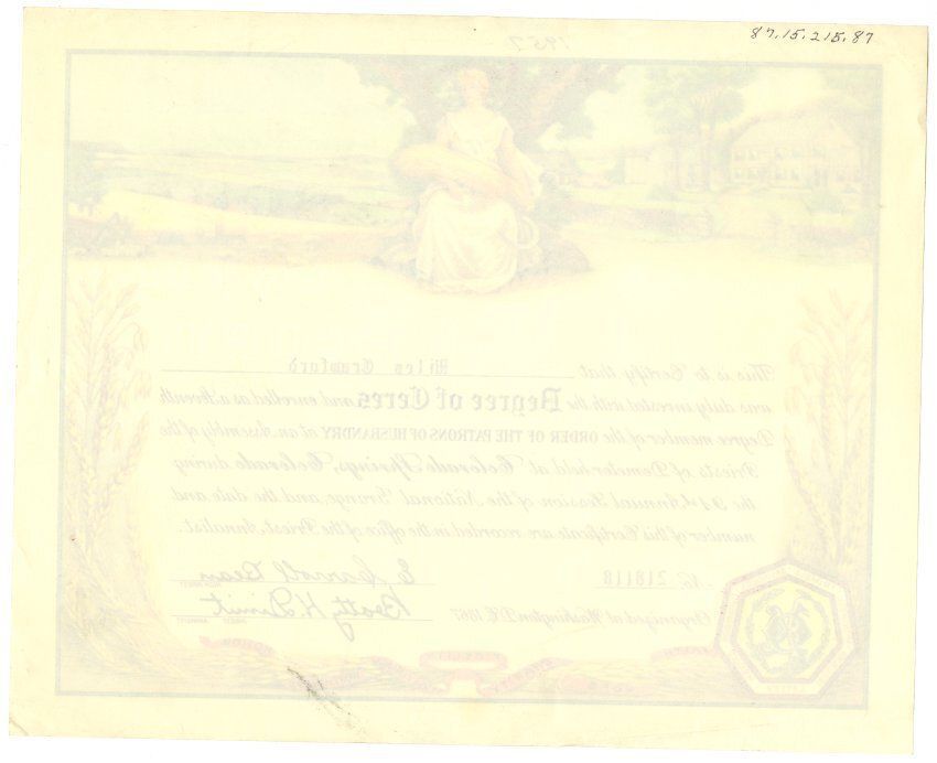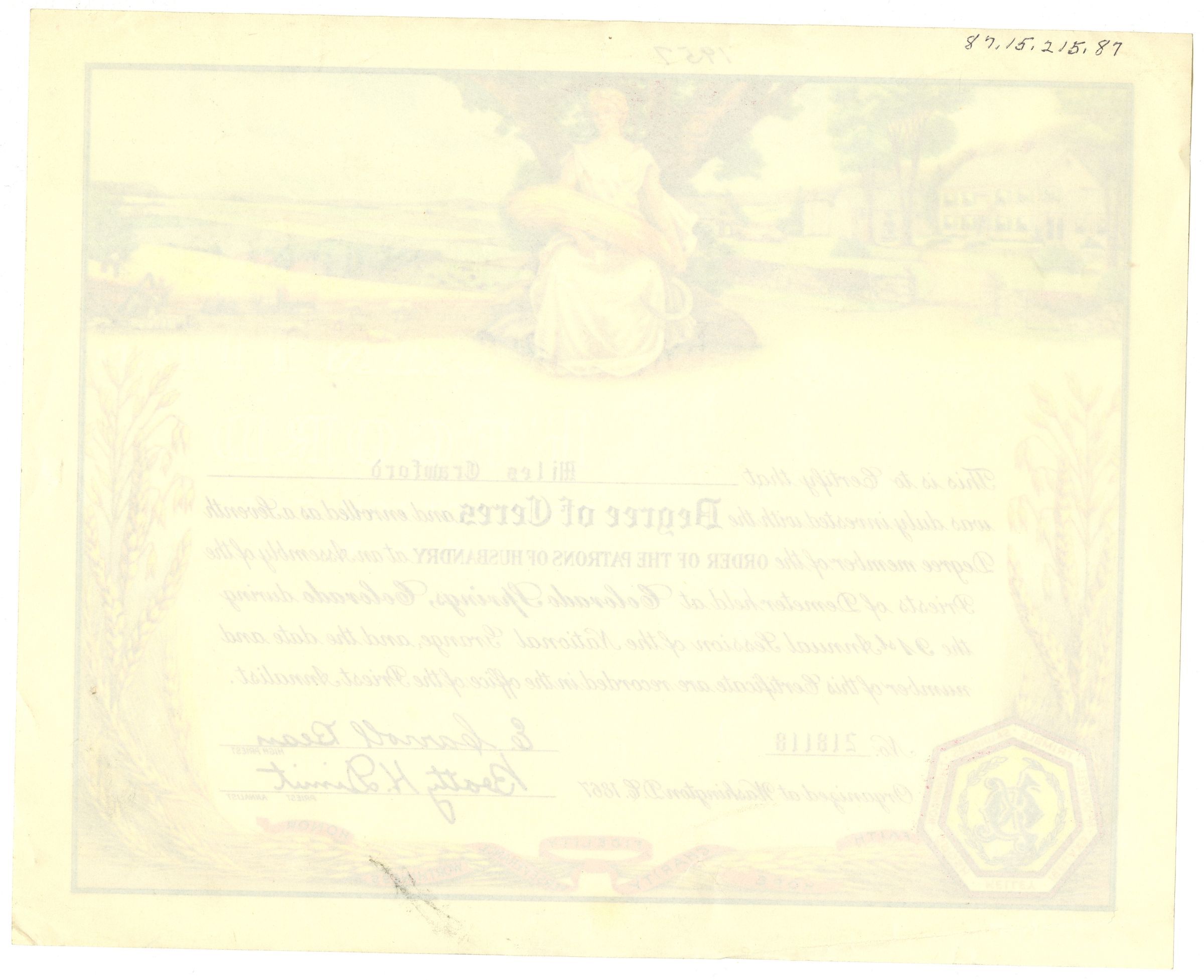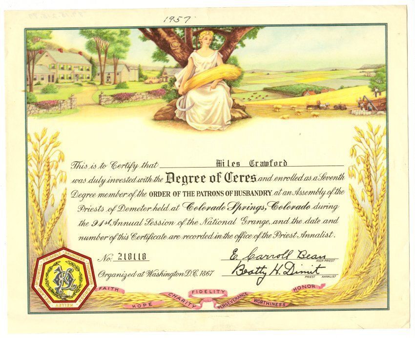 Certificate awarded to Miles Crawford receiving the Degree of Ceres from the Assembly of the Priests of Demeter at the 91st Annual Session of the National Grange. The year 1957 is written on the top of the page.
