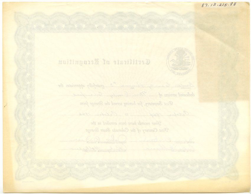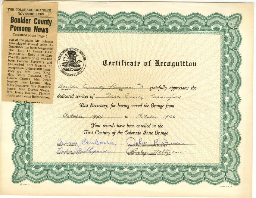 Attached to the certificate is a newspaper clipping from "The Colorado Granger," from November 1973, listsing her alongside other past secretaries.Collection