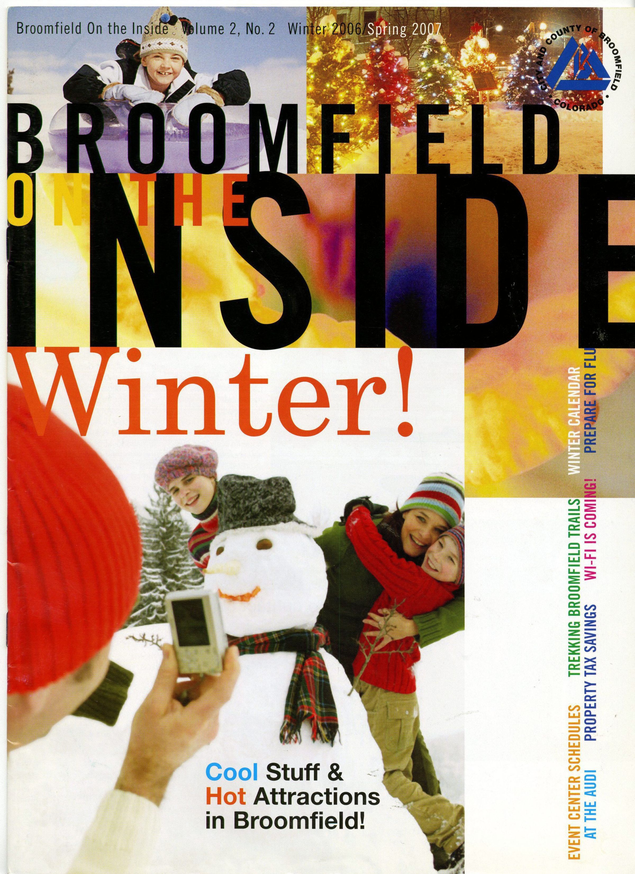 A copy of "Broomfield On the Inside." It is volume 2 issue 2 for Winter 2006 and Spring 2007. Articles include "Happy Birthday, Broomfield," Oh my, Wi-Fi," "Snow & Ice," "Broomfield Events Center Schedules," and "Plan ahead for flu."Publication Details