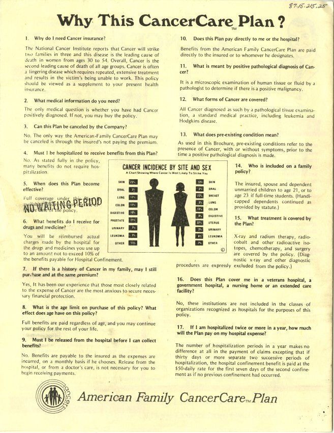 The front page is a letter from Henry Christensen, Master, with details on the program. The inside pages is the ad, describing the risks of cancer and what the CancerCare program entails. The back page is further information about the program, titled "Why This CancerCare Plan?"Collection