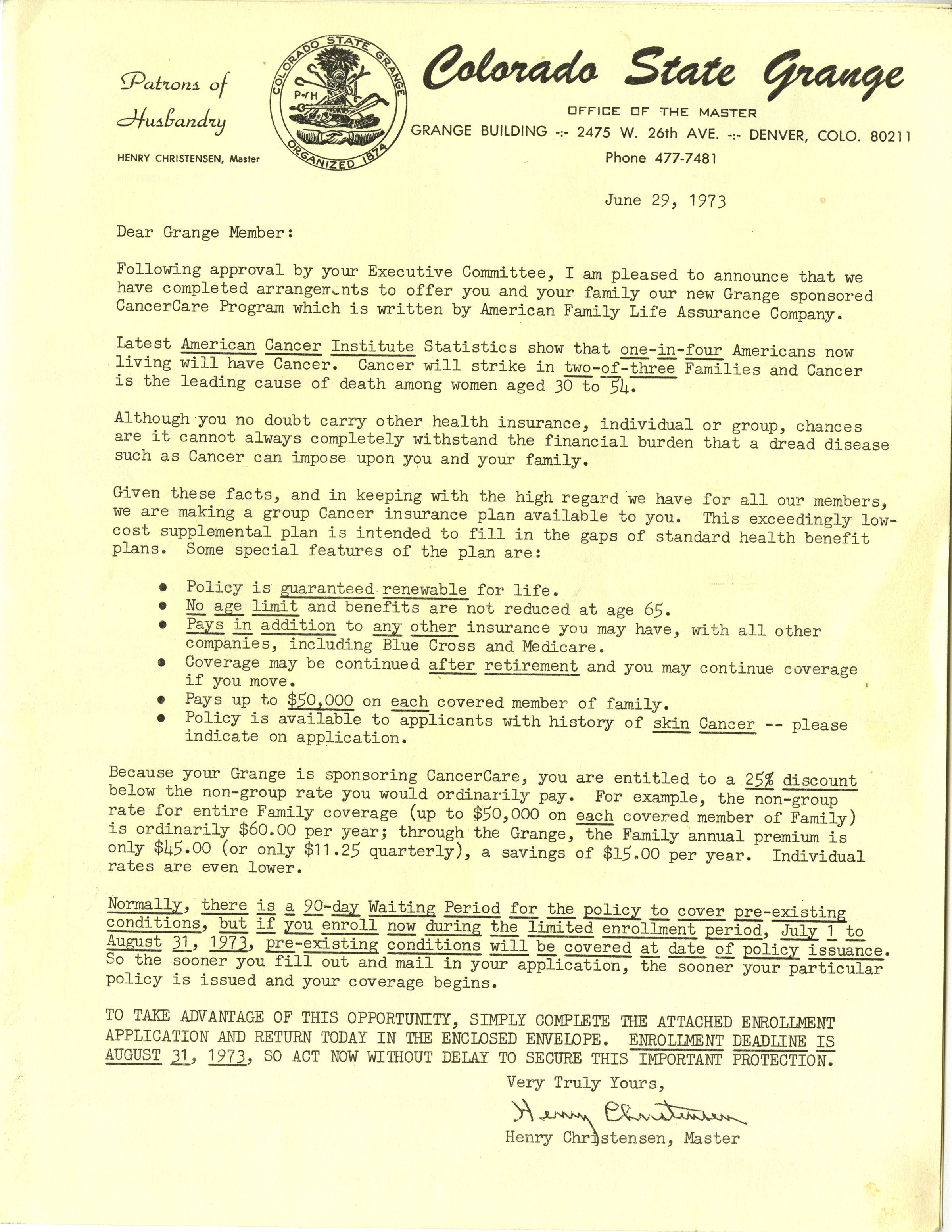 A two-page offer from the Colorado State Grange for Grange members to join a CancerCare program.