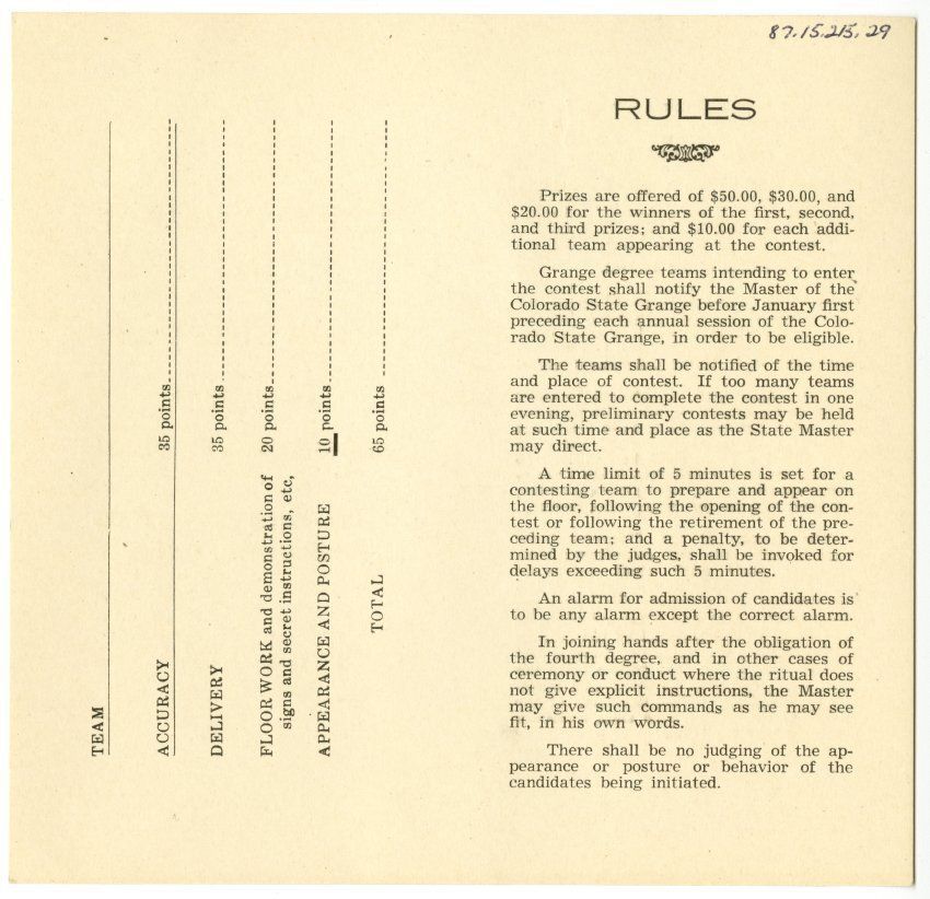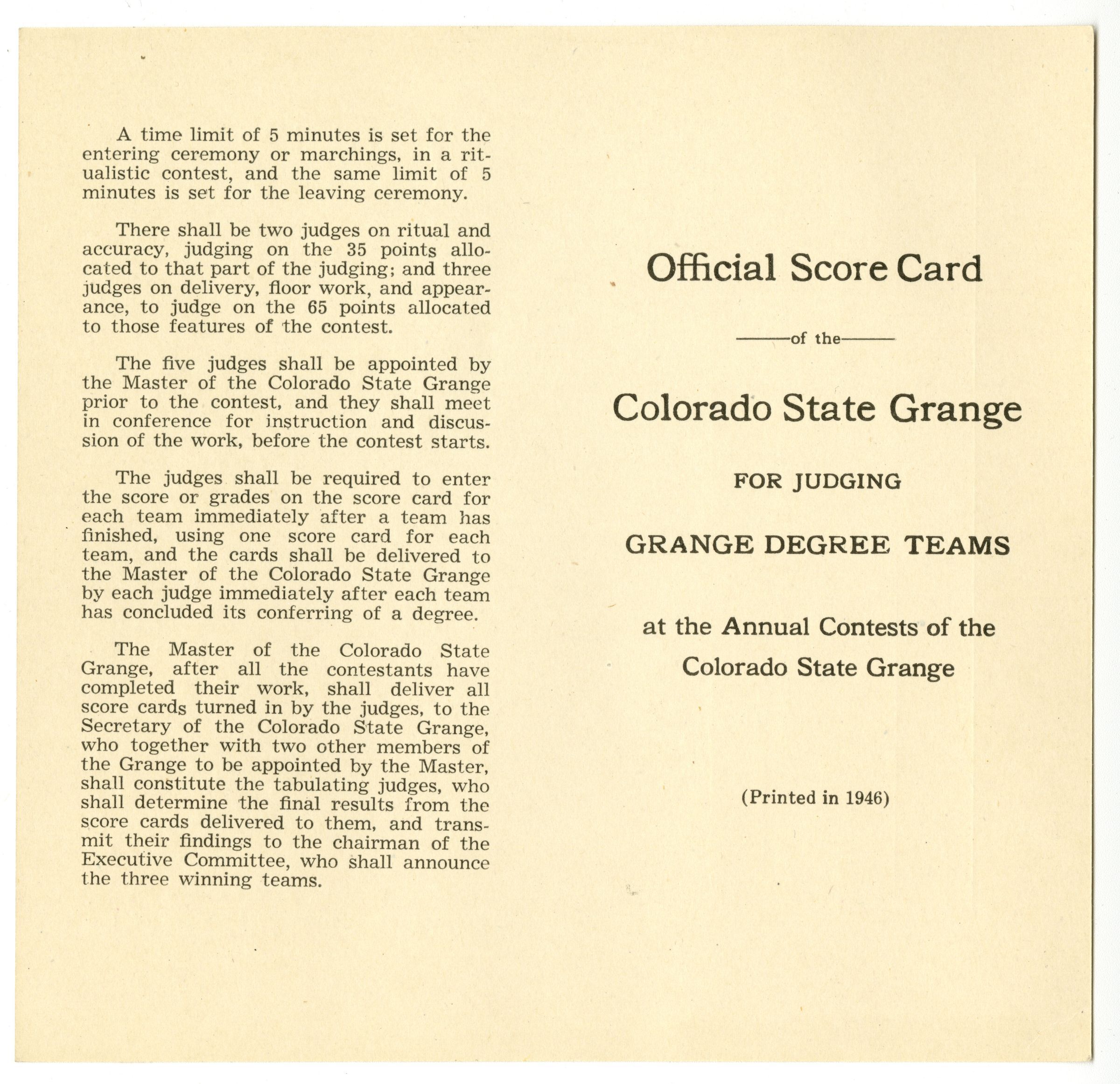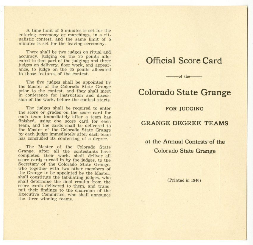 Official Score Card of the Colorado State Grange for Judging Grange Degree Teams at the Annual Contests of the Colorado State Grange. (Printed in 1946). Includes rules for the ceremony, rules for judging, and the scorecard itself.