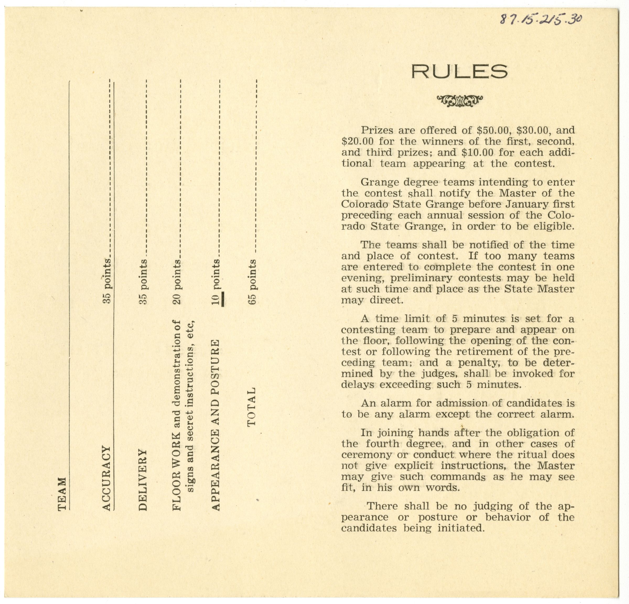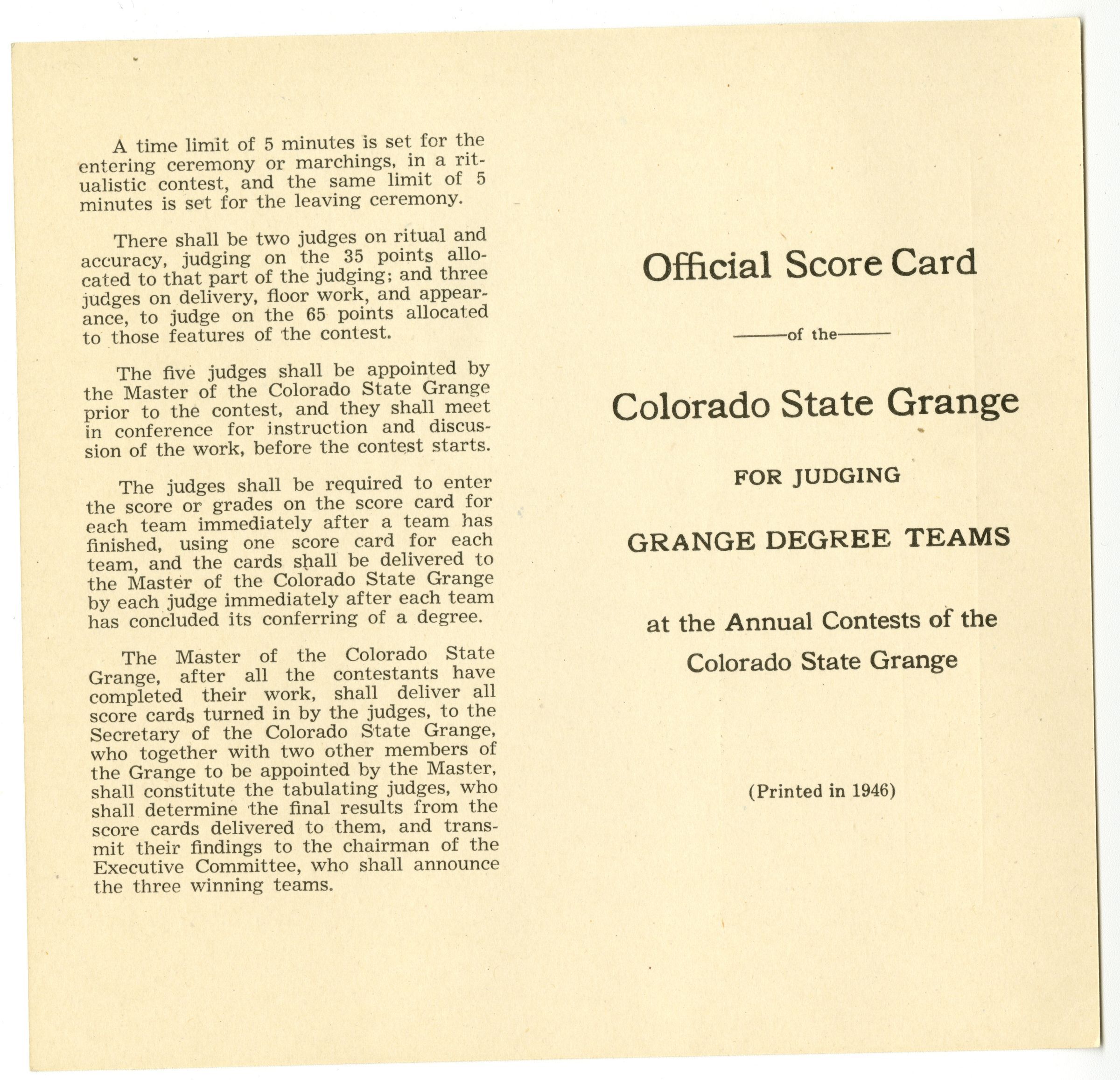 Official Score Card of the Colorado State Grange for Judging Grange Degree Teams at the Annual Contests of the Colorado State Grange. (Printed in 1946). Includes rules for the ceremony, rules for judging, and the scorecard itself.