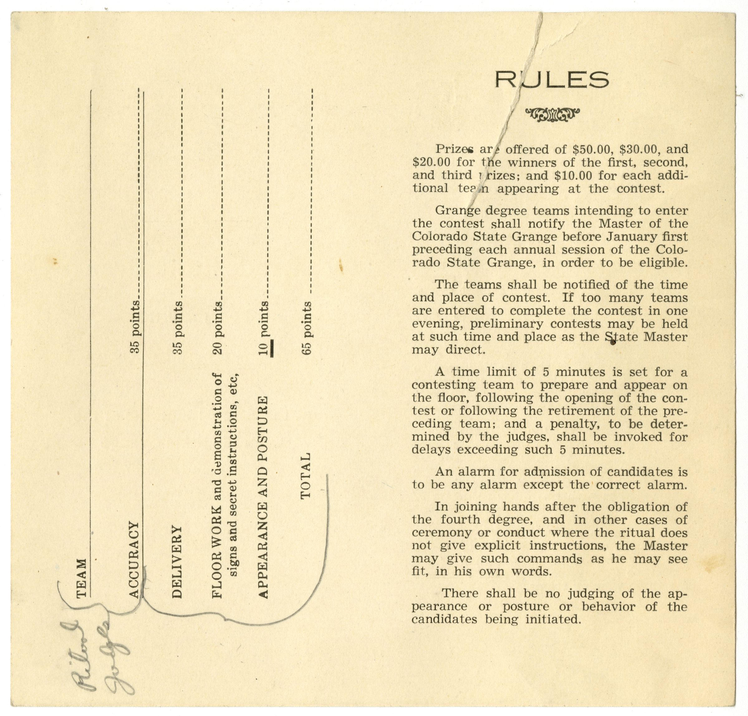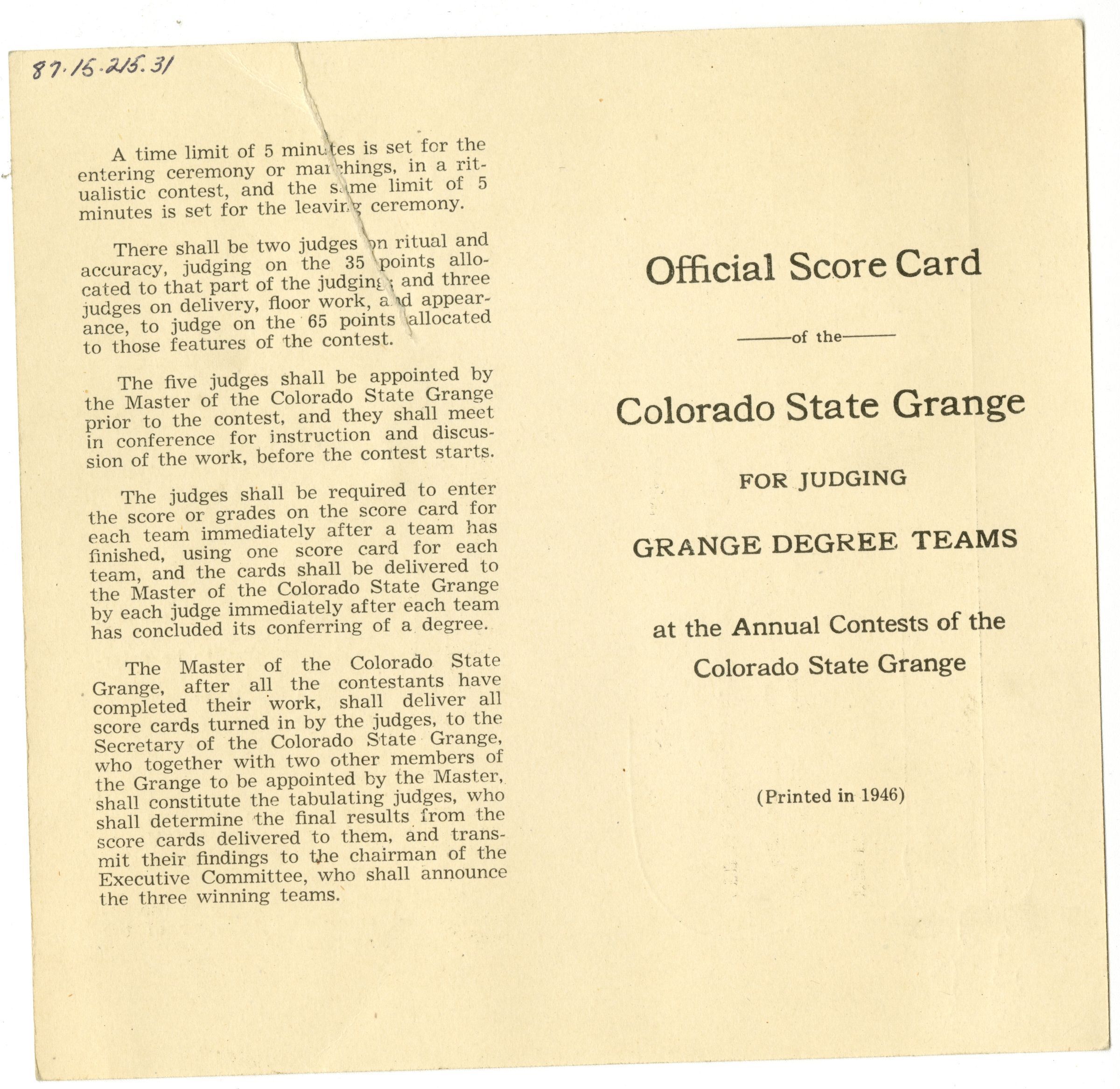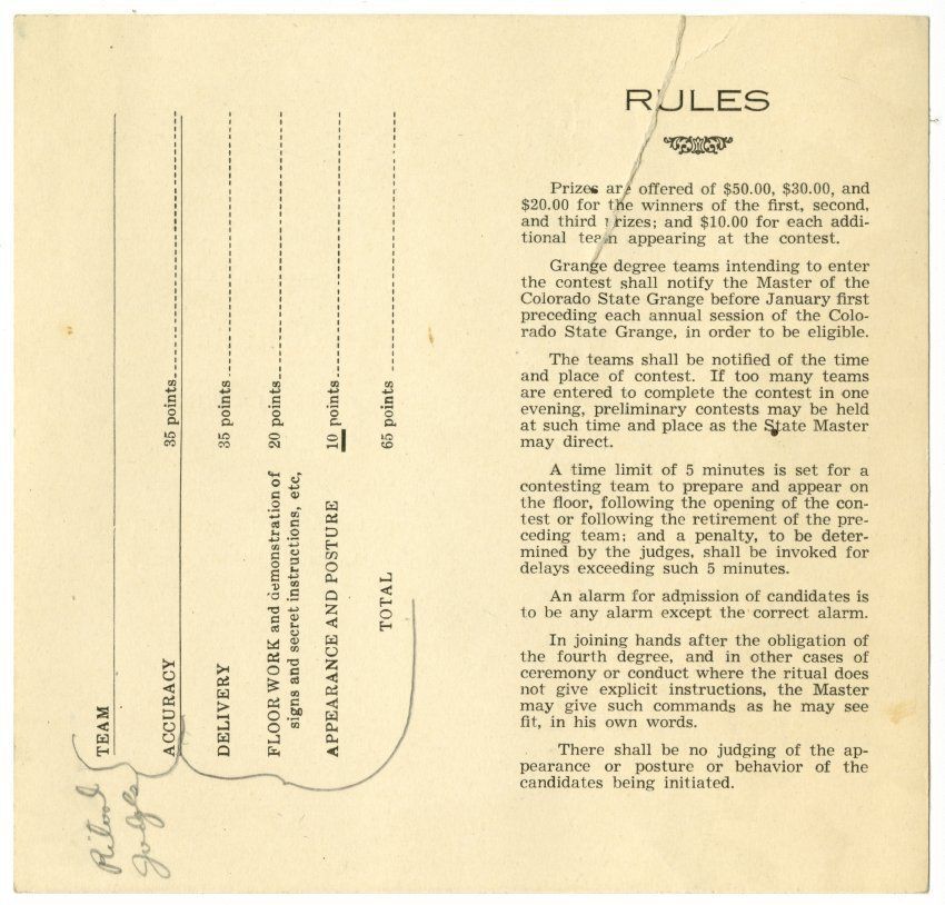 Official Score Card of the Colorado State Grange for Judging Grange Degree Teams at the Annual Contests of the Colorado State Grange. (Printed in 1946).