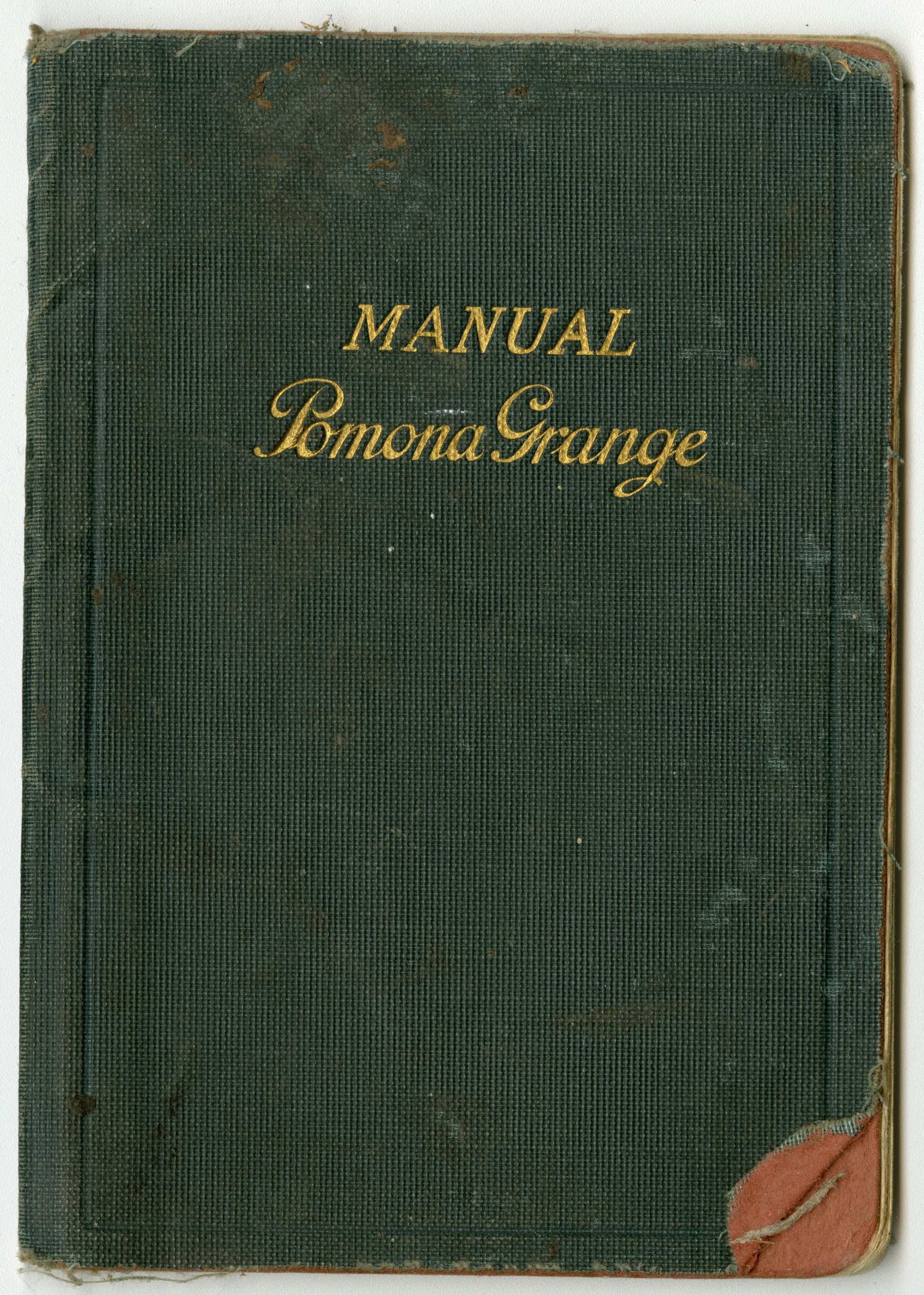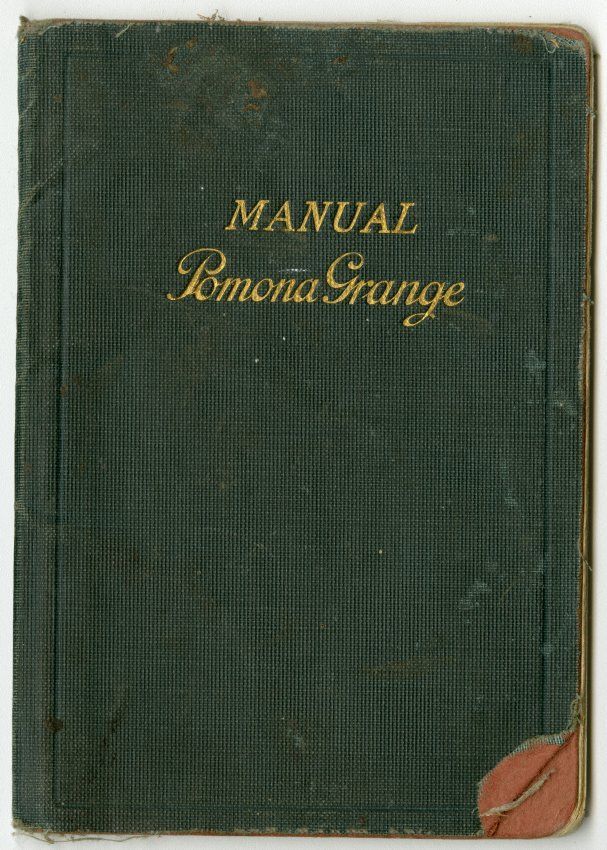 Dark green cover, booklet, "Manual Pomona Grange" written in gold embossed letters. Some handwriting inside in front and in back couple pages of the book. "Miles Crawford 1938" written inside front cover.Collection
