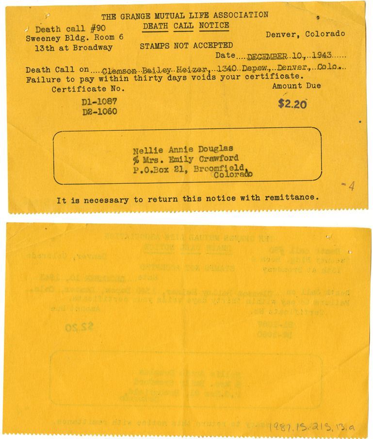 a: Yellow paper, "Death call on Clemson Bailey Heizer, 1340 Depew, Denver, Colo." Addressed to "Nellie Annie Douglas % Mrs. Emily Crawford, P.O. Box 21, Broomfield, Colorado." Date listed December 10, 1943.