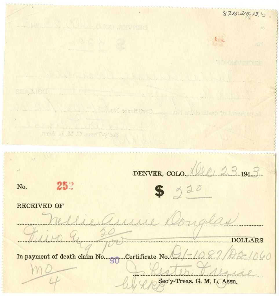 b: Check, "Received of Nellie Annie Douglas, $2.20." Date listed Dec 23, 1943.Collection