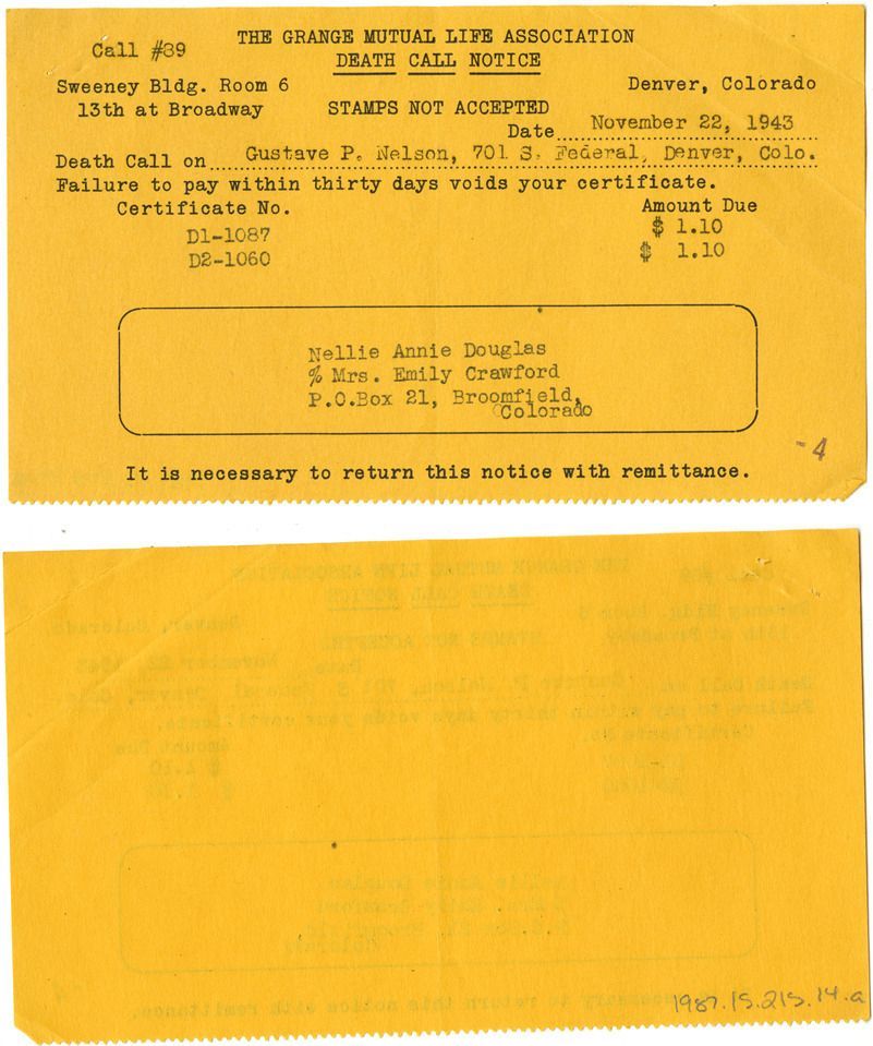 A: Yellow paper, "Death Call on Gustave P. Nelson, 701 S. Federal, Denver, Colo." Addressed to "Nellie Annie Douglas % Mrs. Emily Crawford, P.O. Box 21, Broomfield, Colorado." Date November 22, 1943.
