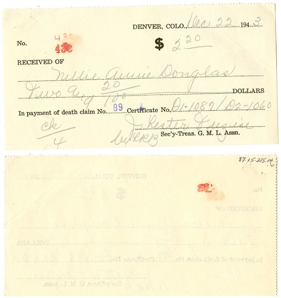 B: Check receipt, "Recieved of Nellie Annie Douglas, $2.20." Date Dec 22, 1943. Red stamp "432."Collection