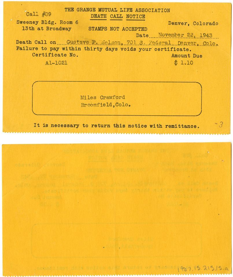 A: Yellow paper, "Death Call on Gustave P. Nelson, 701 S. Federal, Denver, Colo." Addressed to "Miles Crawford, Broomfield, Colo." Date, November 22, 1943.