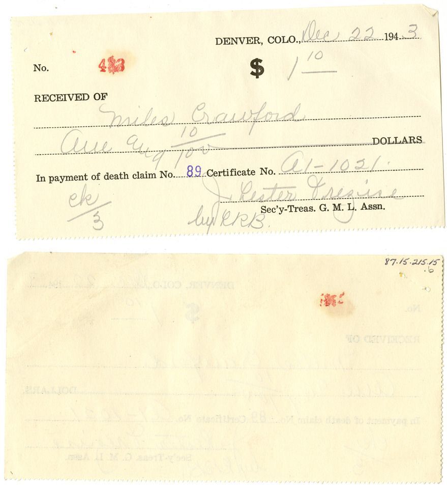 The Grange Mutual Life Association Death Call Notice and check recpiept.