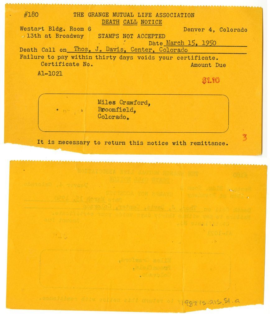 A: Yellow paper, "Death Call on Thos. J. Davis, Center, Colorado" Addressed to "Miles Crawford, Broomfield, Colorado." Dated March 15, 1950.