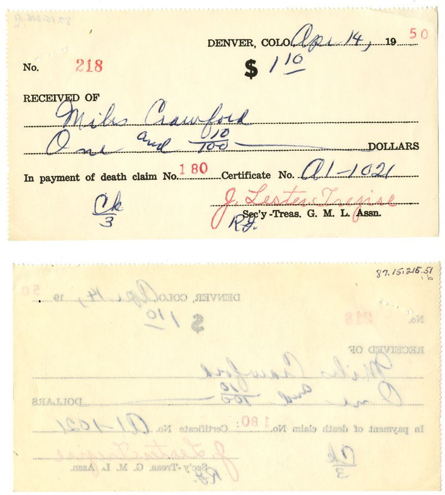 B: Receipt, "Recieved of Miles Crawford," $1.10. Dated Apr 14, 1950. Red stamp "218"Collection