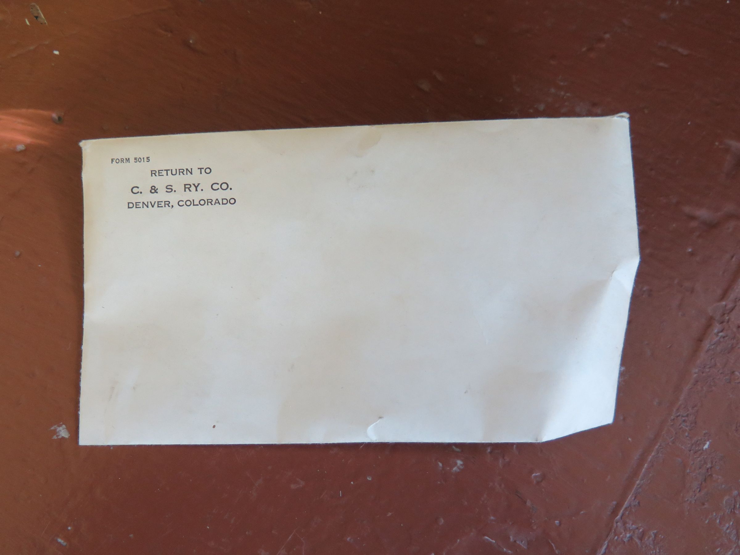 This is 4" (w) x 6.5" (l) white envelope is from the Colorado and Southern Railway. Black text in the top left corner of the front of the envelope reads, "FORM 5015/ RETURN TO/ C. & S. RY. CO./ DENVER, COLORADO."