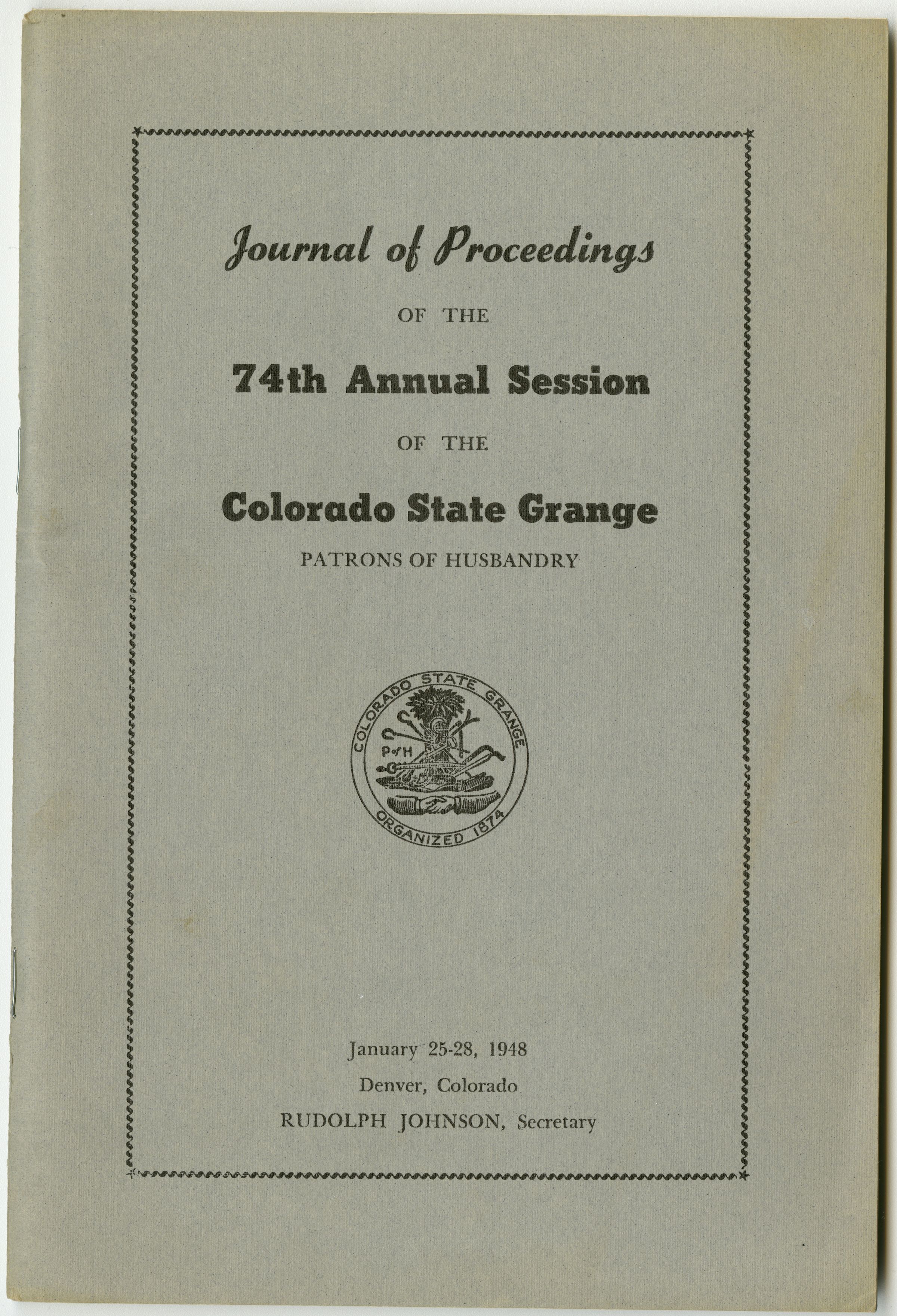 Journal of Proceedings of the 74th Annual Session of the Colorado State Grange, Patrons of Husbandry. January 25-28, 1948, Denver, Coloraod, Rudolph Johnson, Secretary.