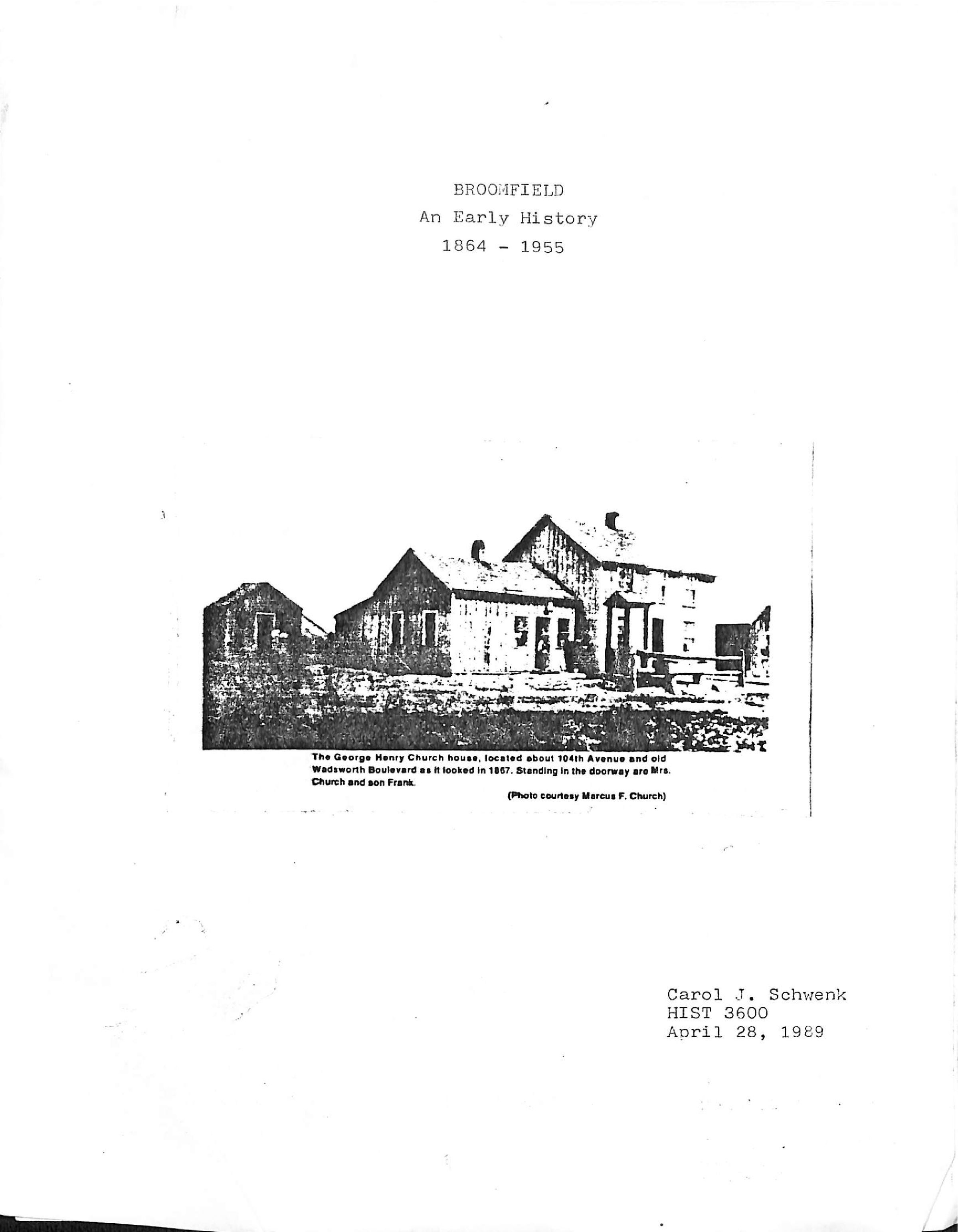 This a paper copy of Broomfield An Early History 1864-1955 by Carol J. Schwenk on April 28,1989. The front has an image of the George Henry Church house with Mrs. Church and her son Frank standing in the doorway. It has 26 pages with black and white photos and appears to have the typewriter style font.Collection