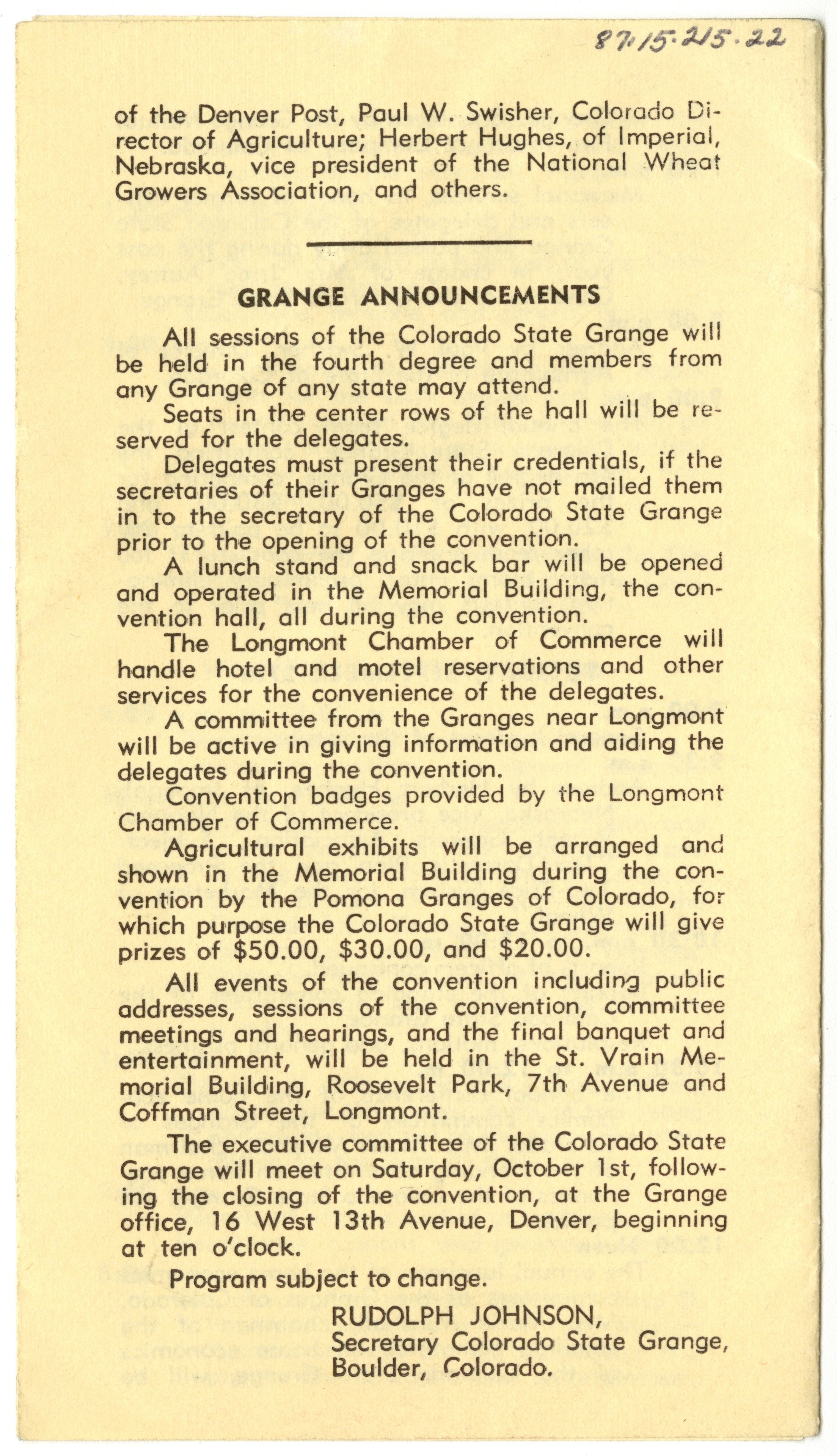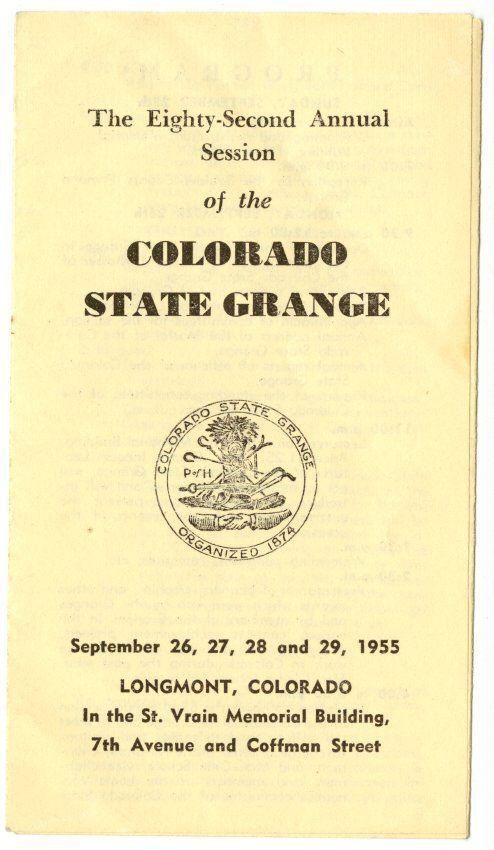The Eighty-Second Annual Session of the Colorado State Grange, September 26, 27, 28, and 29, 1955. Longmont, Colorado, In the St. Vrain Memorial Building, 7th Avenue and Coffman Street.
