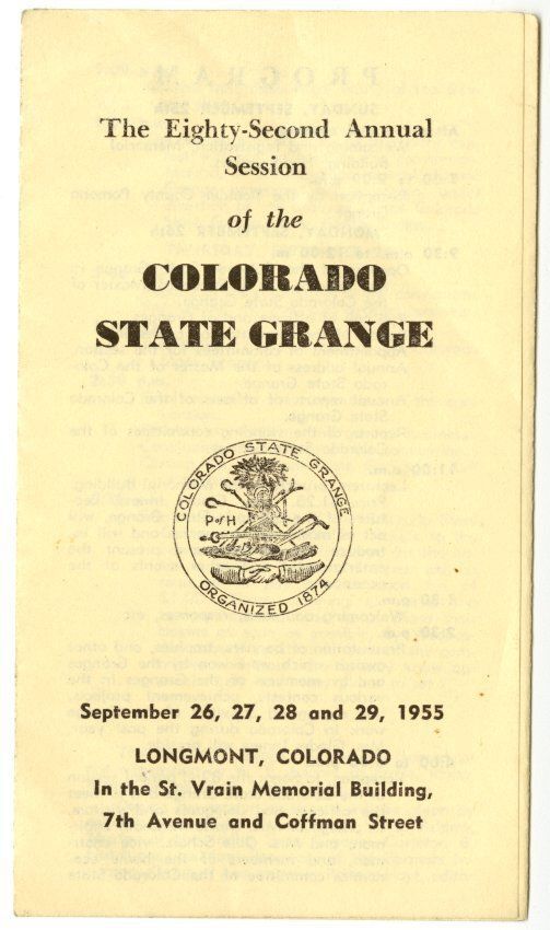 The Eighty-Second Annual Session of the Colorado State Grange, September 26, 27, 28, and 29, 1955. Longmont, Colorado, In the St. Vrain Memorial Building, 7th Avenue and Coffman Street.