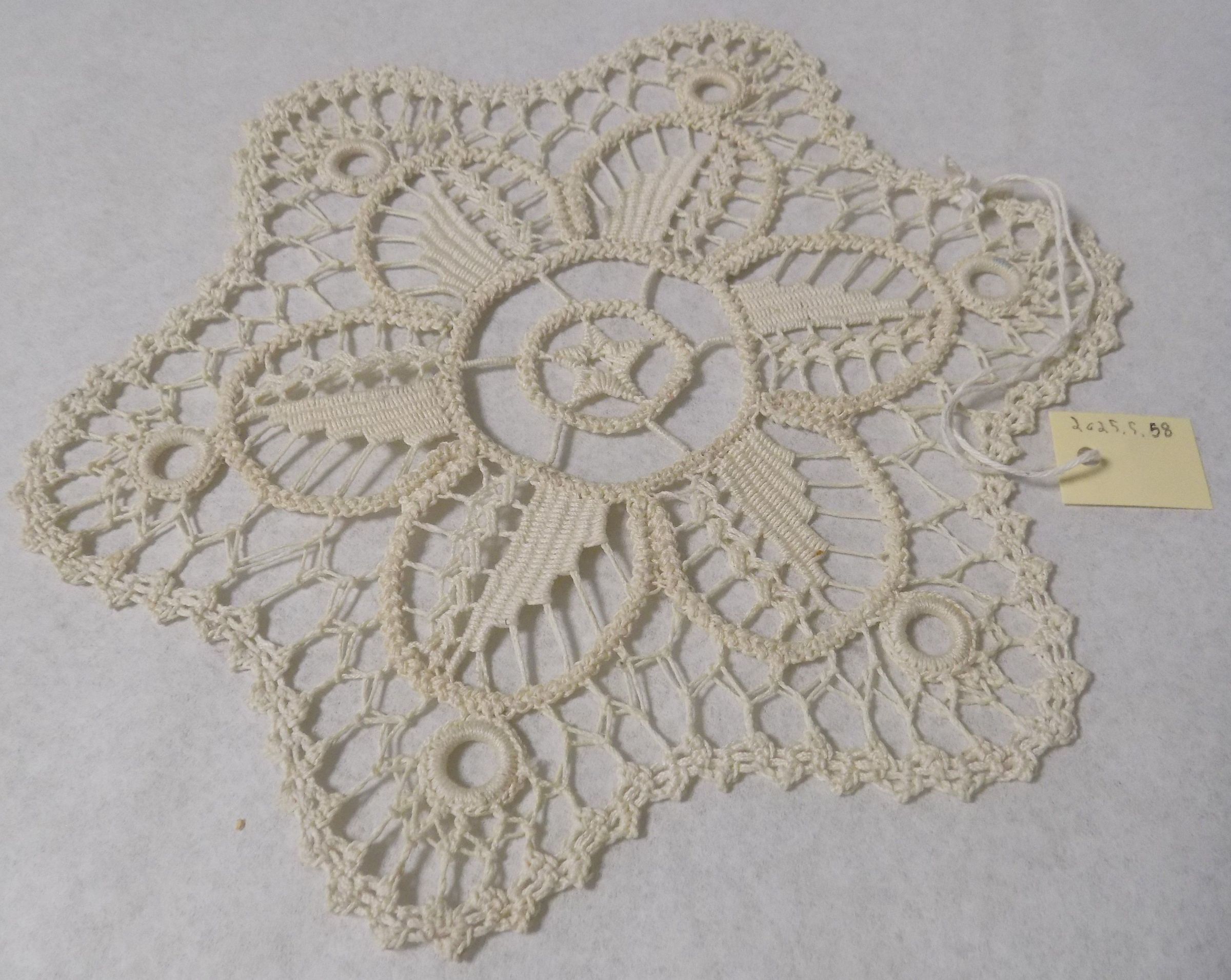 Item is a six-pronged doily made solely of white embroidery, likely from the 1970s. Between the embroidered areas is empty space, but the doily still holds its shape. It is shaped like a snowflake and has a star at its center.Collection
