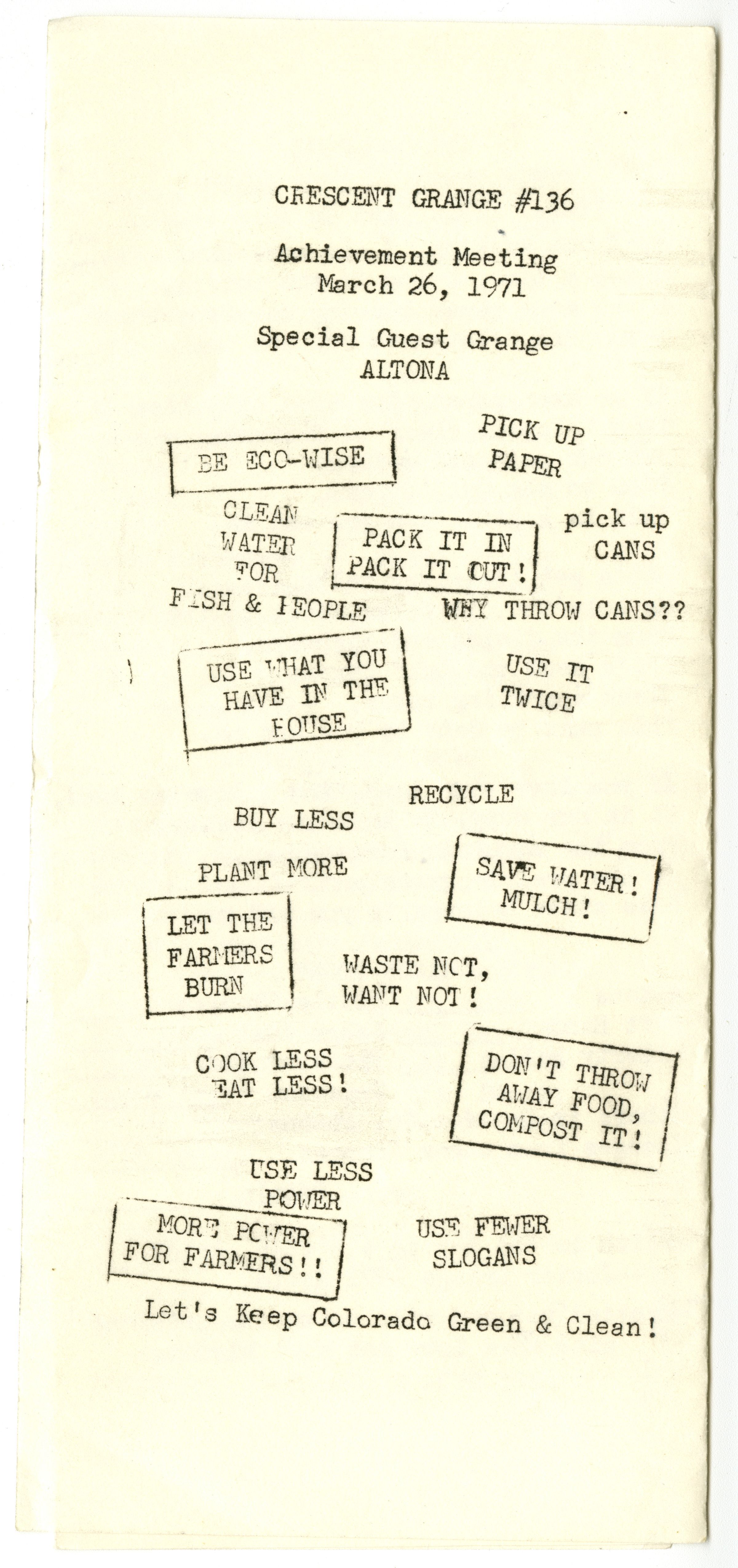 Crescent Grange #136 Achievement Meeting March 26, 1971. Special Guest Grange Altona.