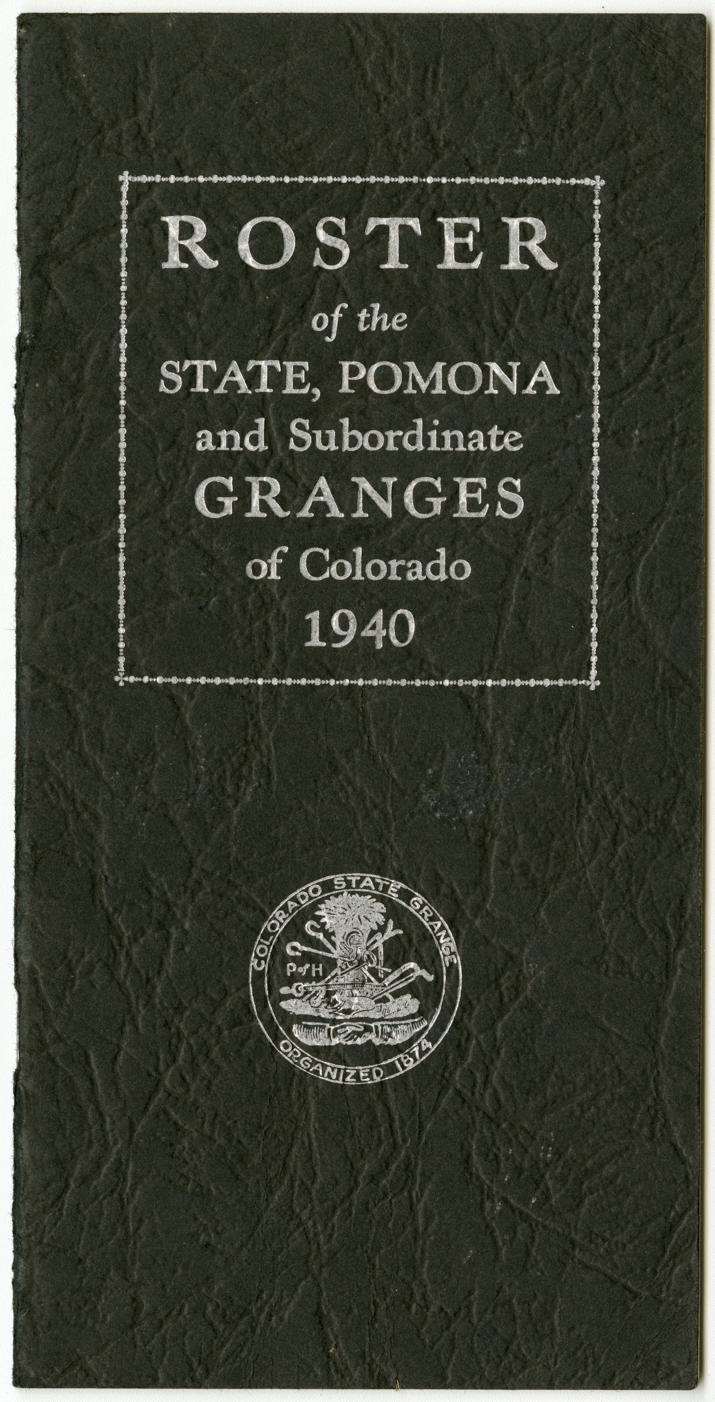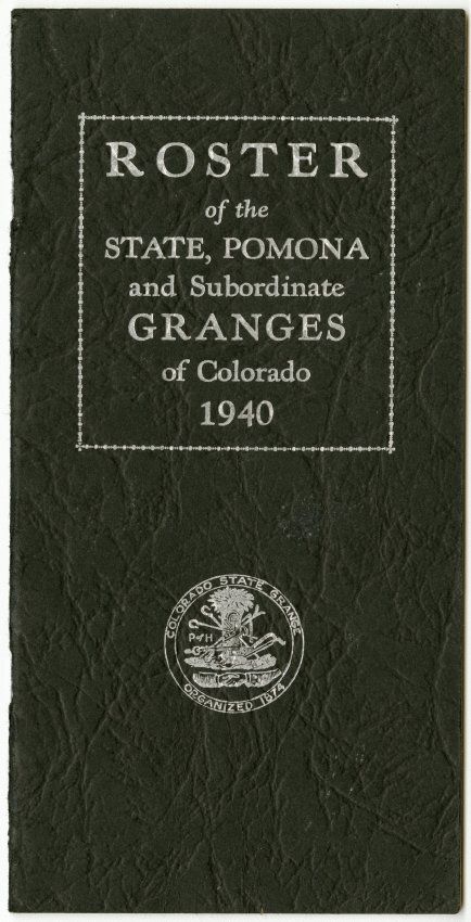 Roster of the State, Pomona, and Subordinate Granges of Colorado 1940. Black cover, Colorado State Grange seal on cover.