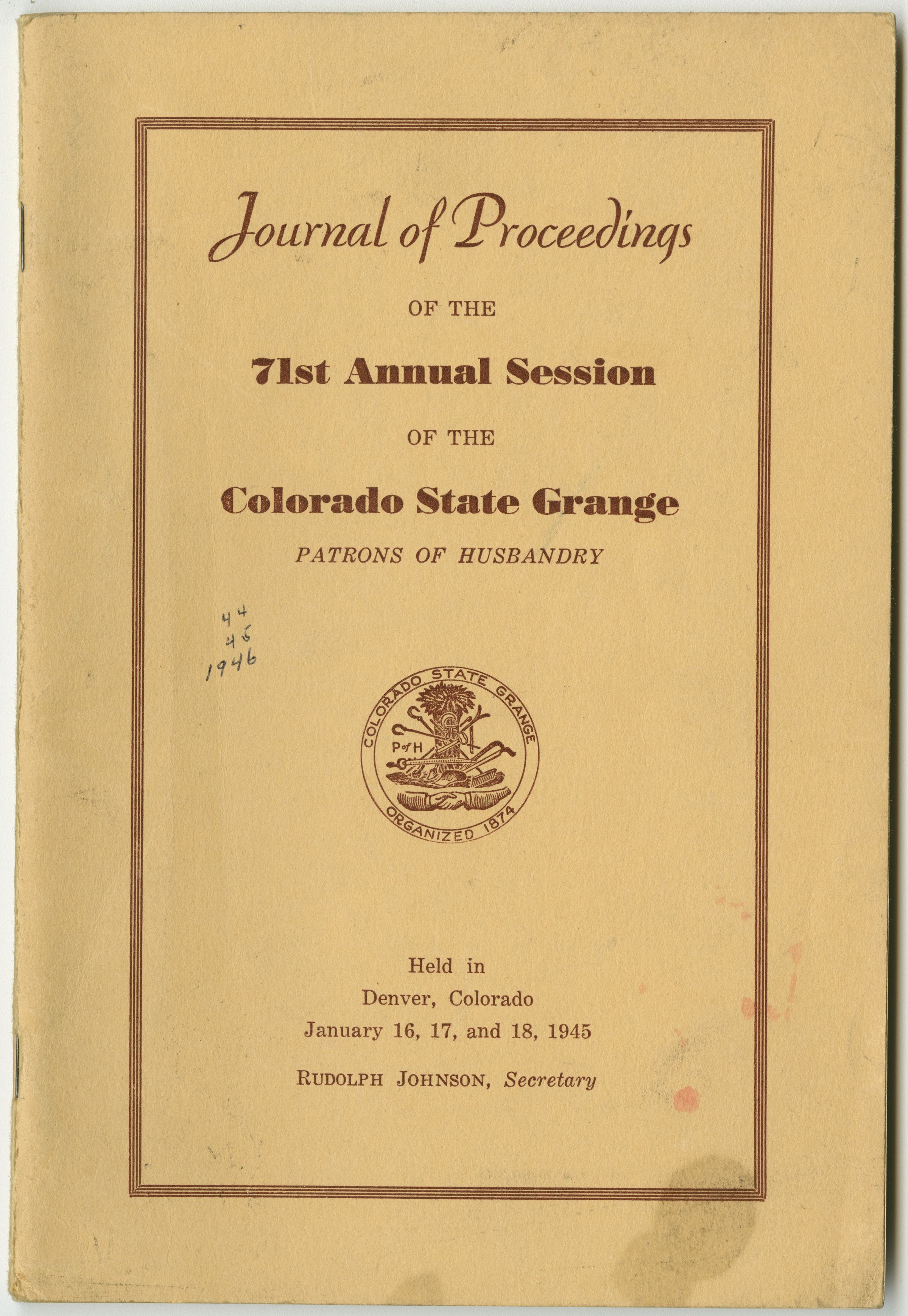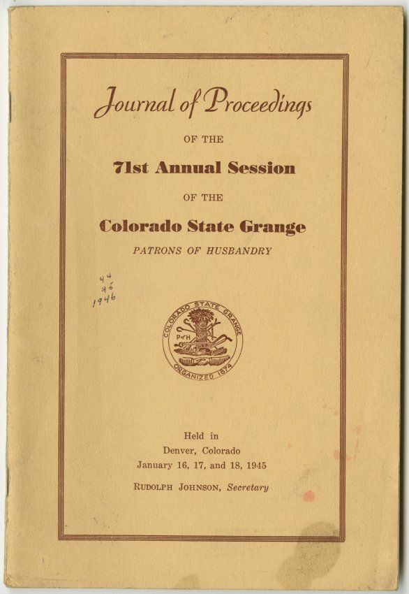 Journal of Proceedings of the 71st Annual Session of the Colorado State Grange Patrons of Husbandry. Held in Denver, Colorado January 16, 17, and 18, 1945. Rudolph Johnson, Secretary.
