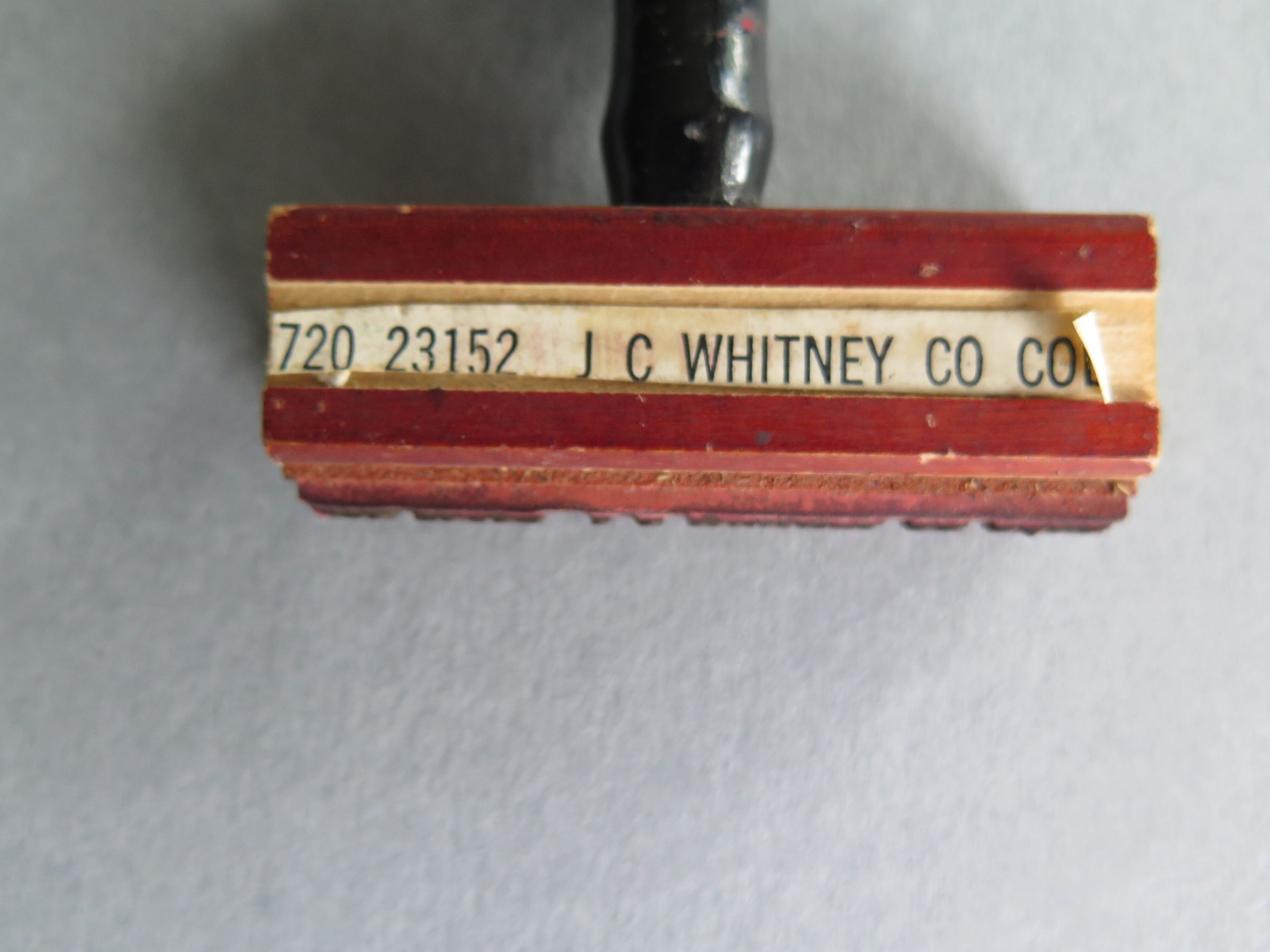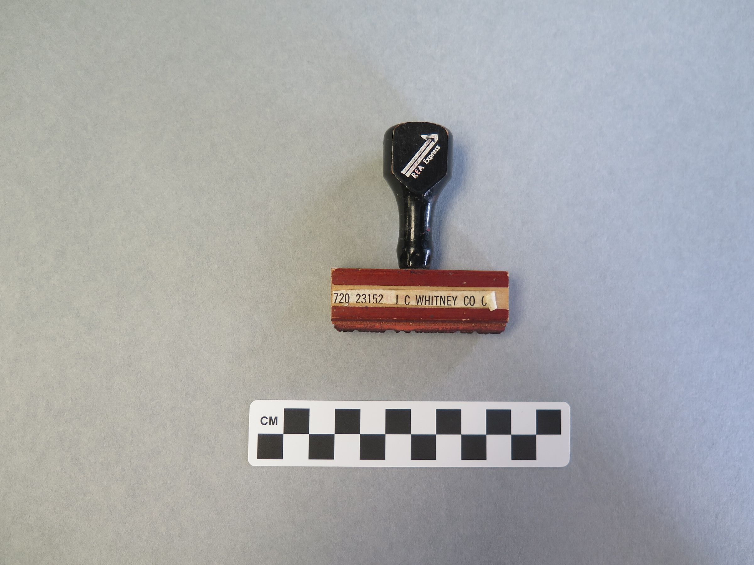 Rubber stamp with a wood base and wood handle. White print on handle reads: "REA Express." Rubber stamp reads: "720 23152 J C WHITNEY CO COLO." This stamp was used in the Broomfield Depot. The stamp measures 3" (h) x 2.5" (w) x 0.75" (d).