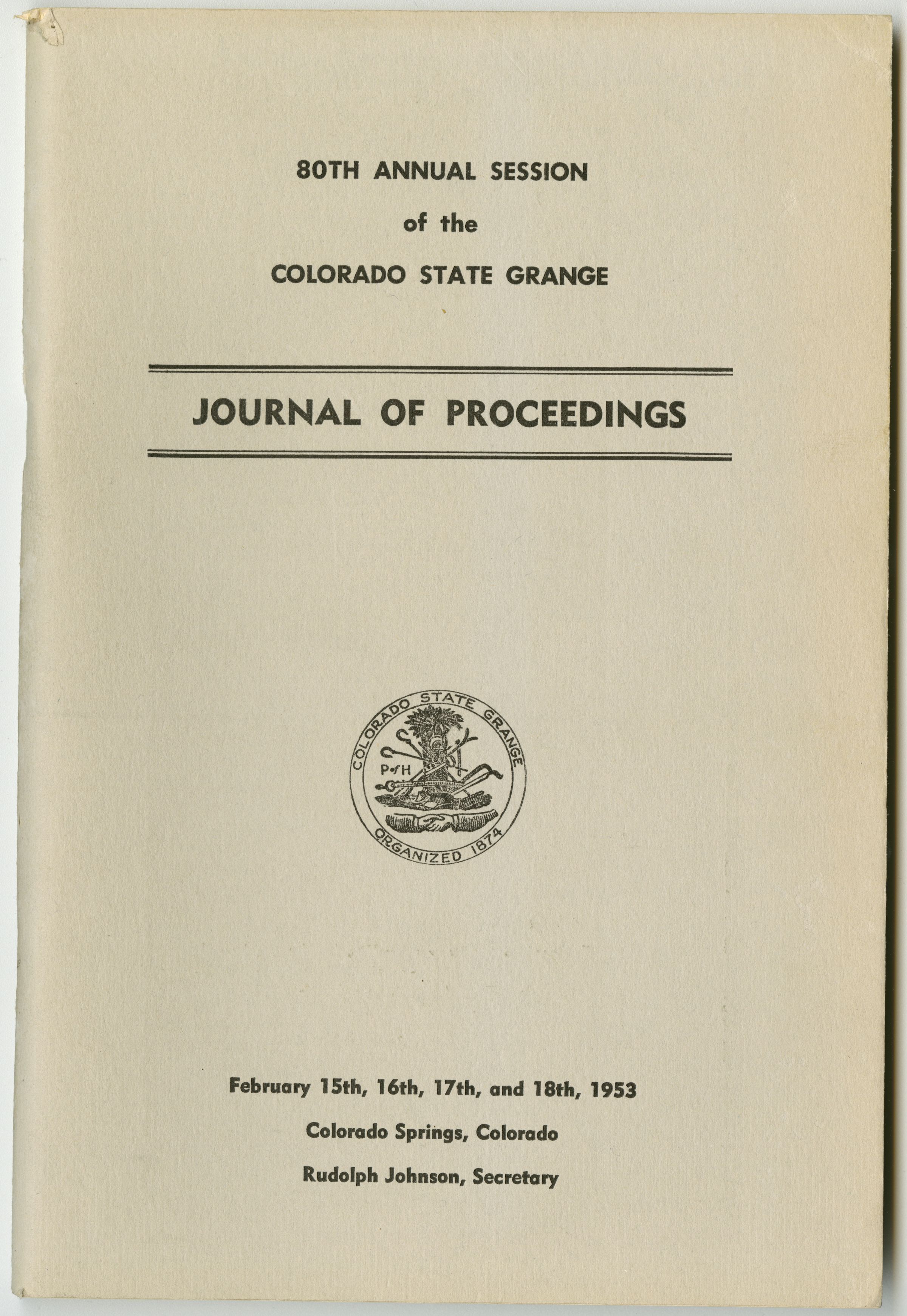 80th Annual Session of the Colorado State Grange Journal of Proceedings. February 15th, 16th, 17th, and 18th, 1953. Colorado Springs, Colorado. Rudolph Johnson, Secretary.