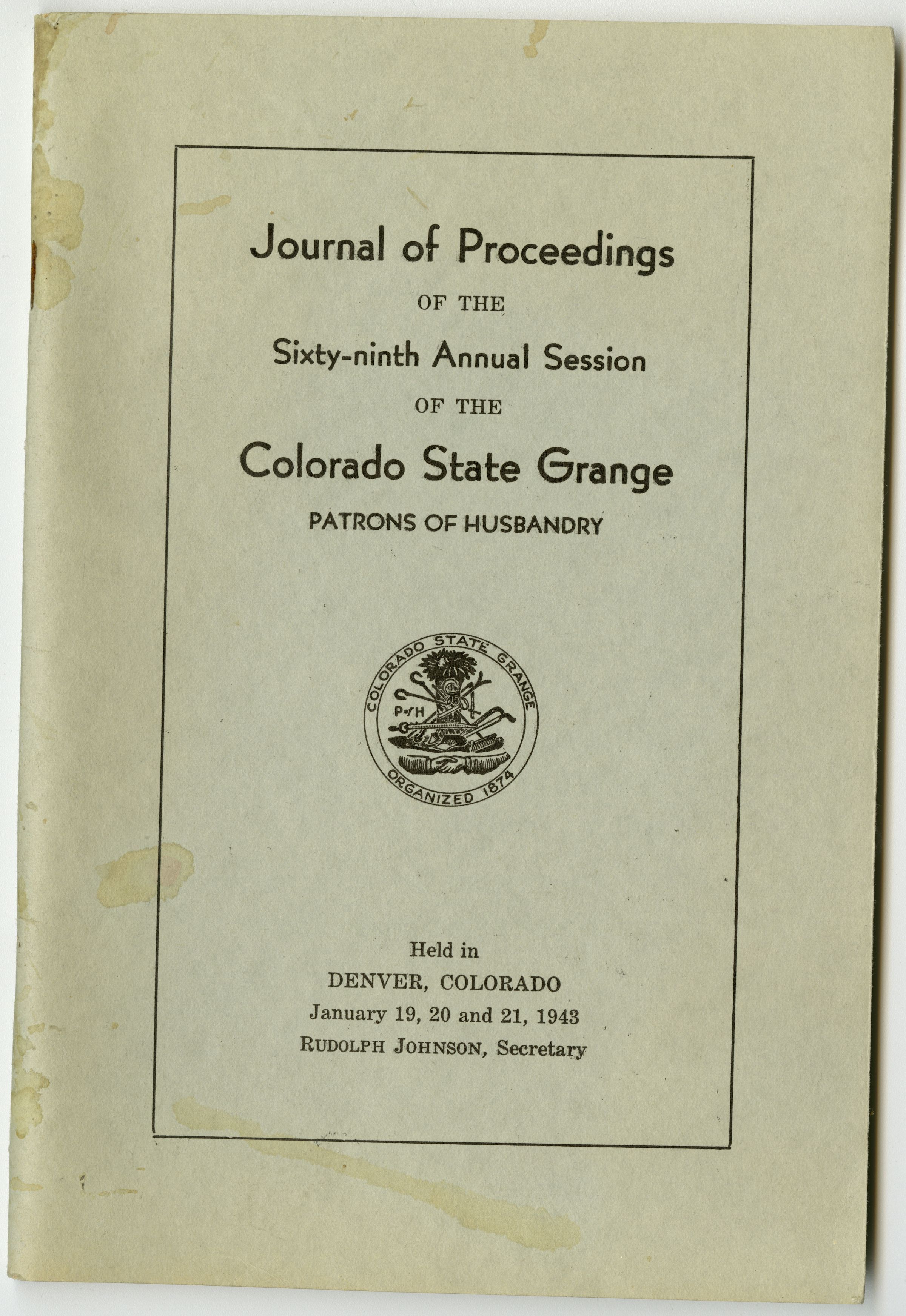 Journal of Proceedings of the Sixty-Ninth Annual Session of the Colorado State Grange, Patrons of Husbandry. Held in Denver, Colorado, January 19, 20 and 21, 1943. Rudolph Johnson, Secretary.