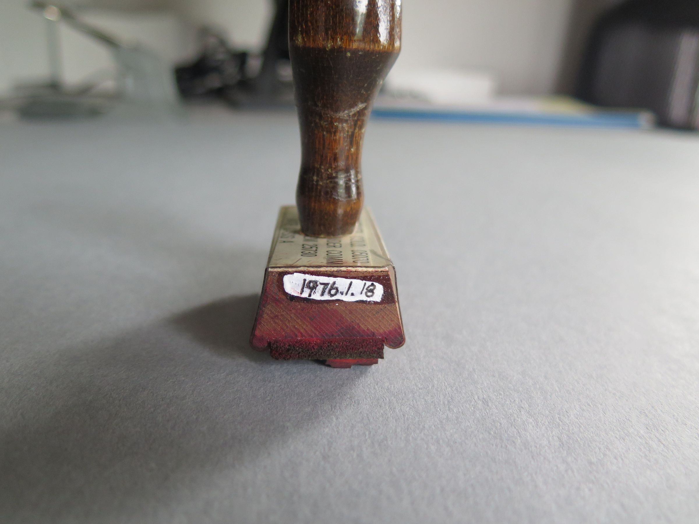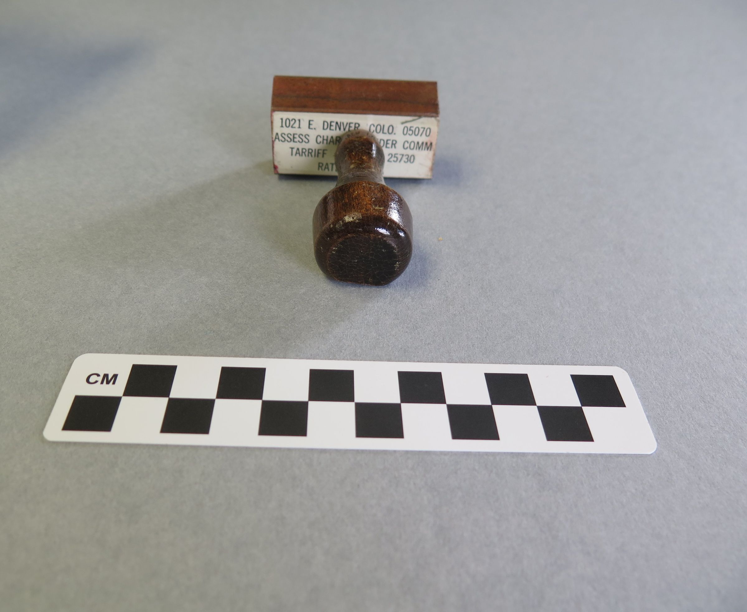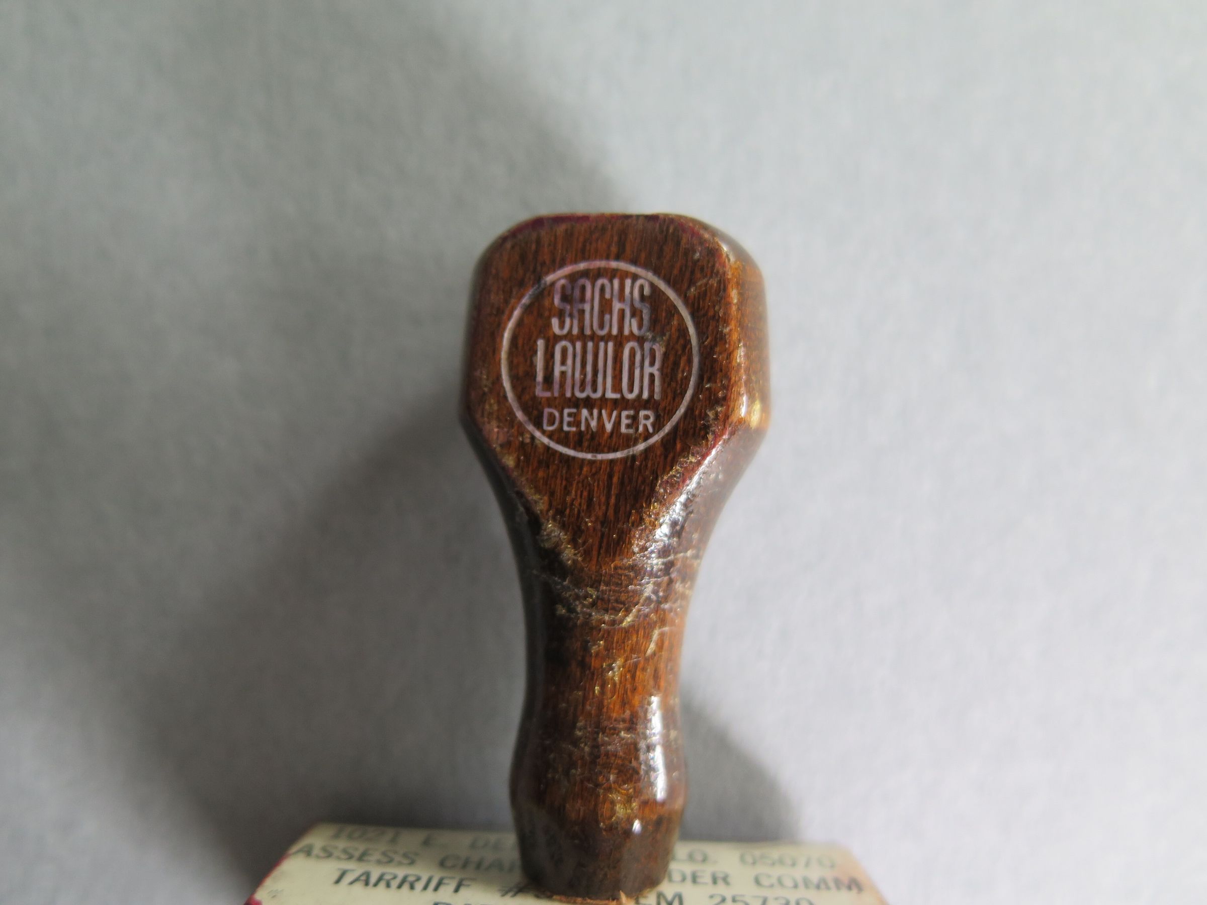 Rubber stamp with a wood base and wood handle. White print on handle reads: "SACHS LAWLOR DENVER." Rubber stamp reads: "1021 E. DENVER COLO. 05070/ASSESS CHARGES UNDER COMM/TARRIFF #33 ITEM 25730/RATE BASIS A." This stamp was used in the Broomfield Depot. The stamp measures 3" (h) x 2" (w) x 1" (d).