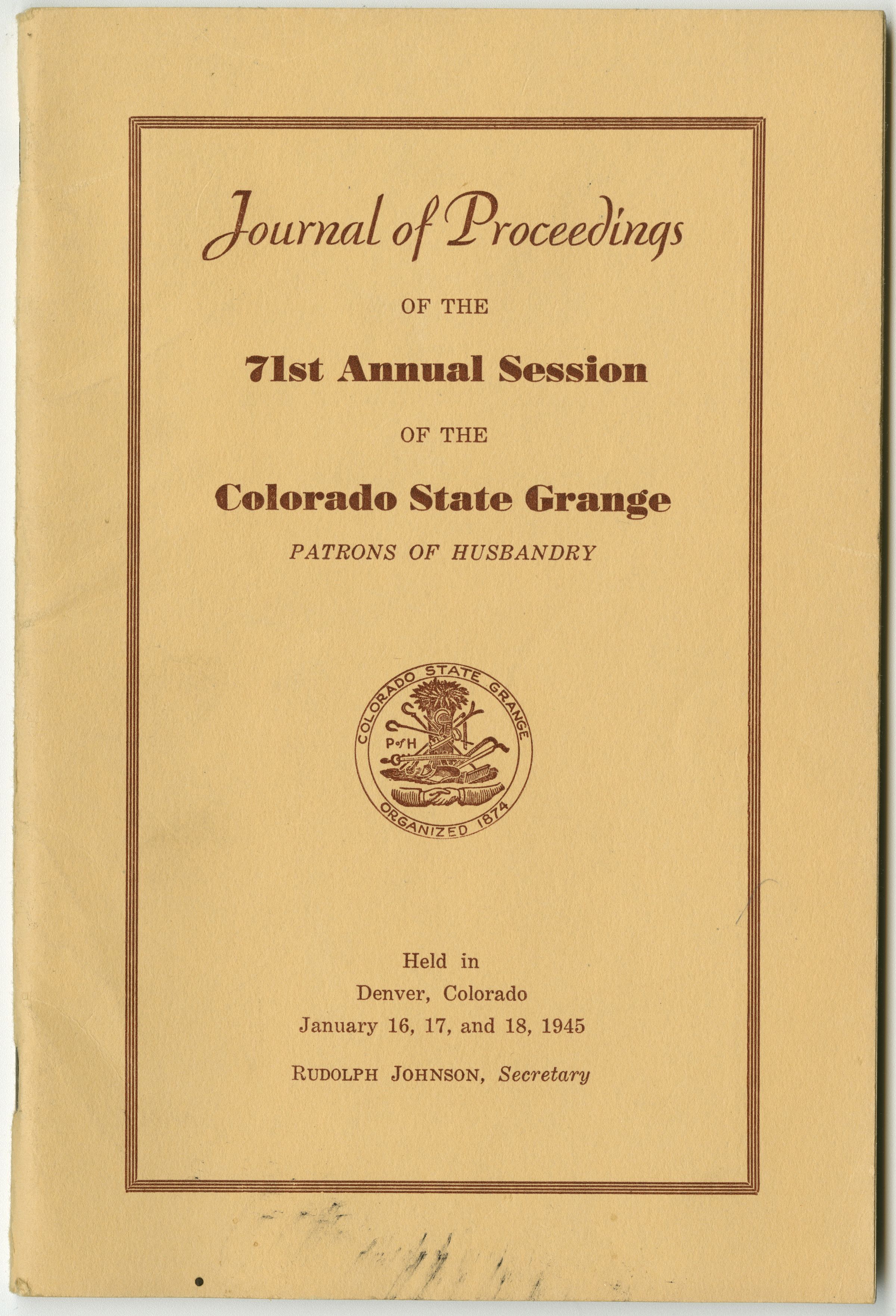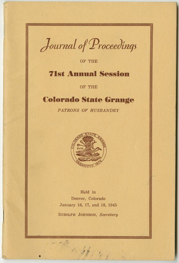 Journal of Proceedings of the 71st Annual Session of the Colorado State Grange Patrons of Husbandry. Held in Denver, Colorado January 16, 17, and 18, 1945. Rudolph Johnson, Secretary.