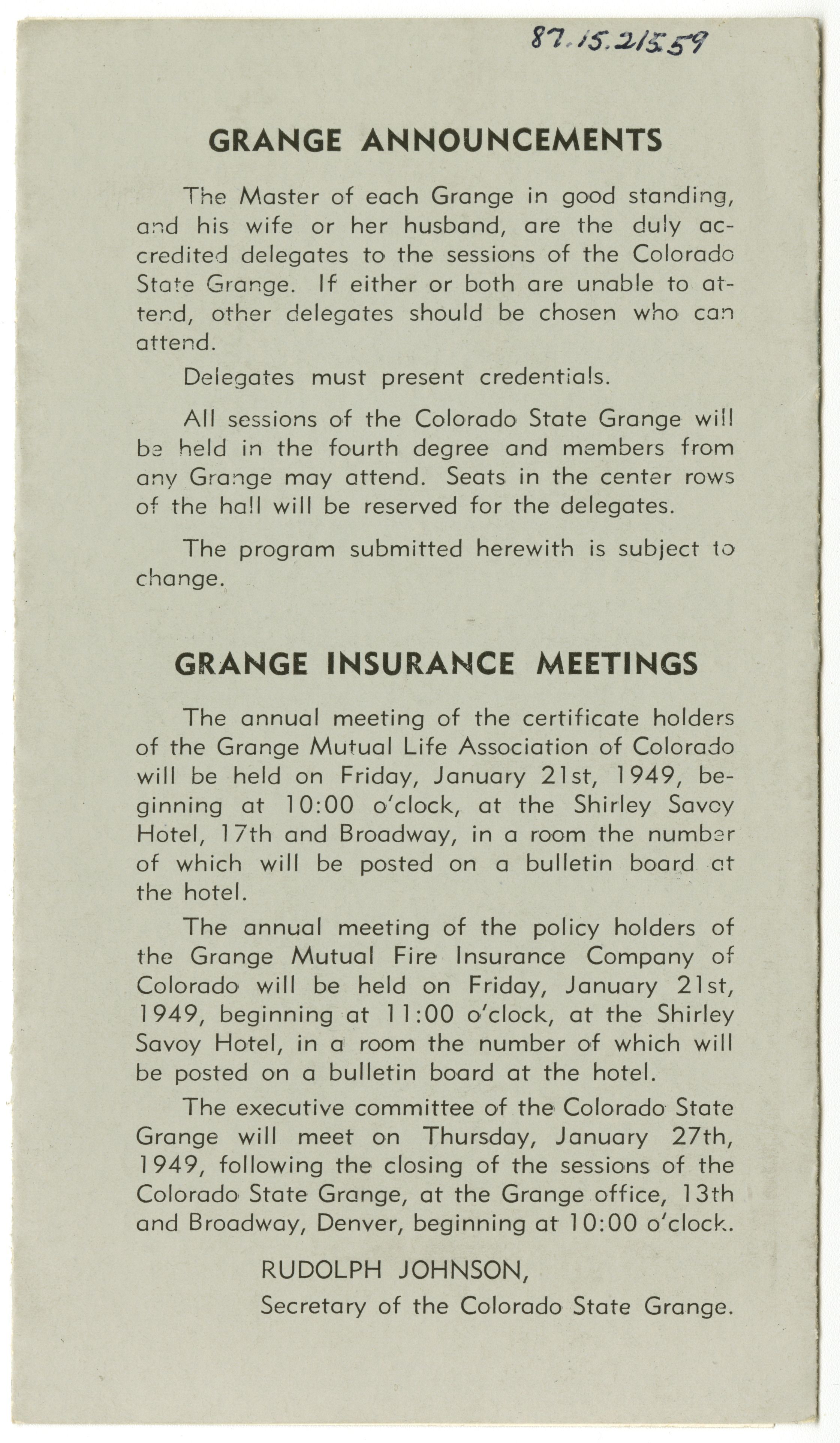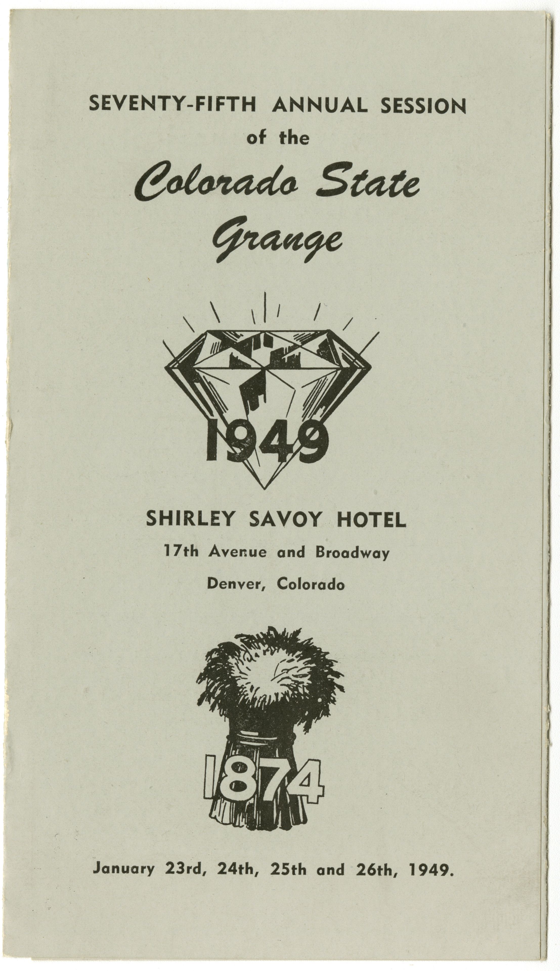 Seventy-Fifth Annual Session of the Colorado State Grange, 1949. Shirley Savoy Hotel, 17th Avenue and Broadway, Denver, Colorado. January 23rd, 24th, and 26th, 1949.