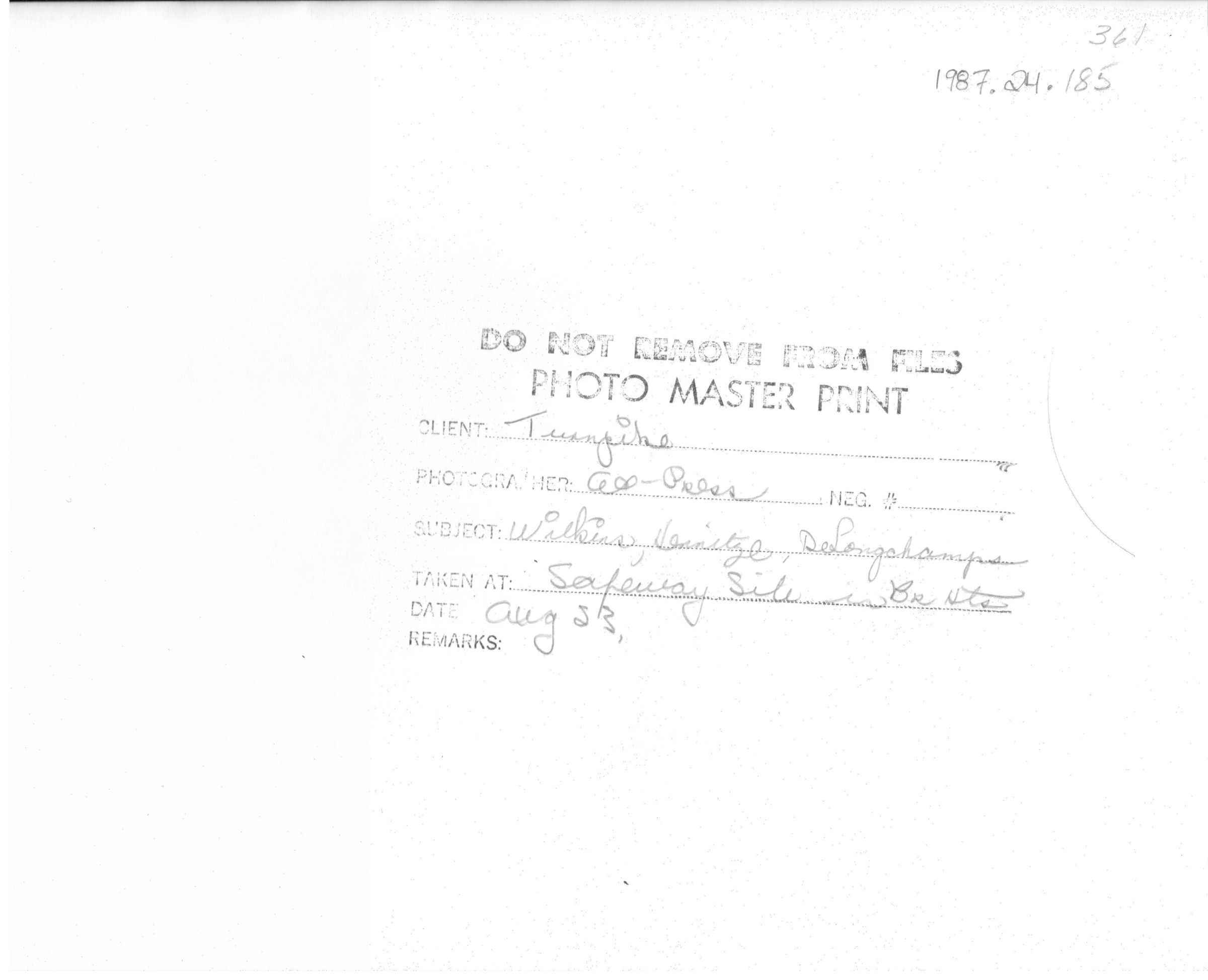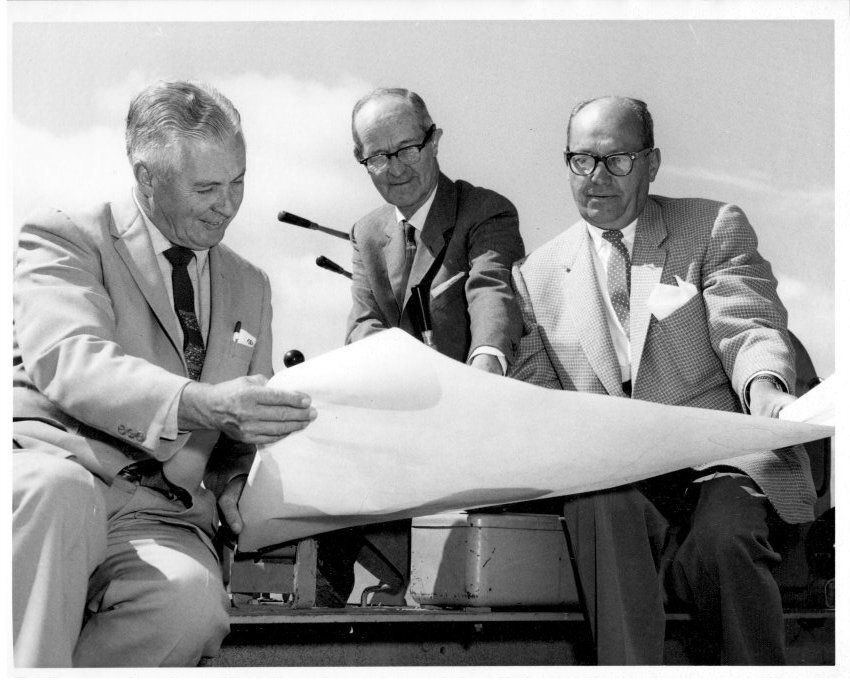 A photo of 3 men sitting on a grater looking at construction plans of the Safeway site in Broomfield Heights. The men are identified as a Mr. Wilkins, H? and a Mr. DeLongchamps. (b/w)