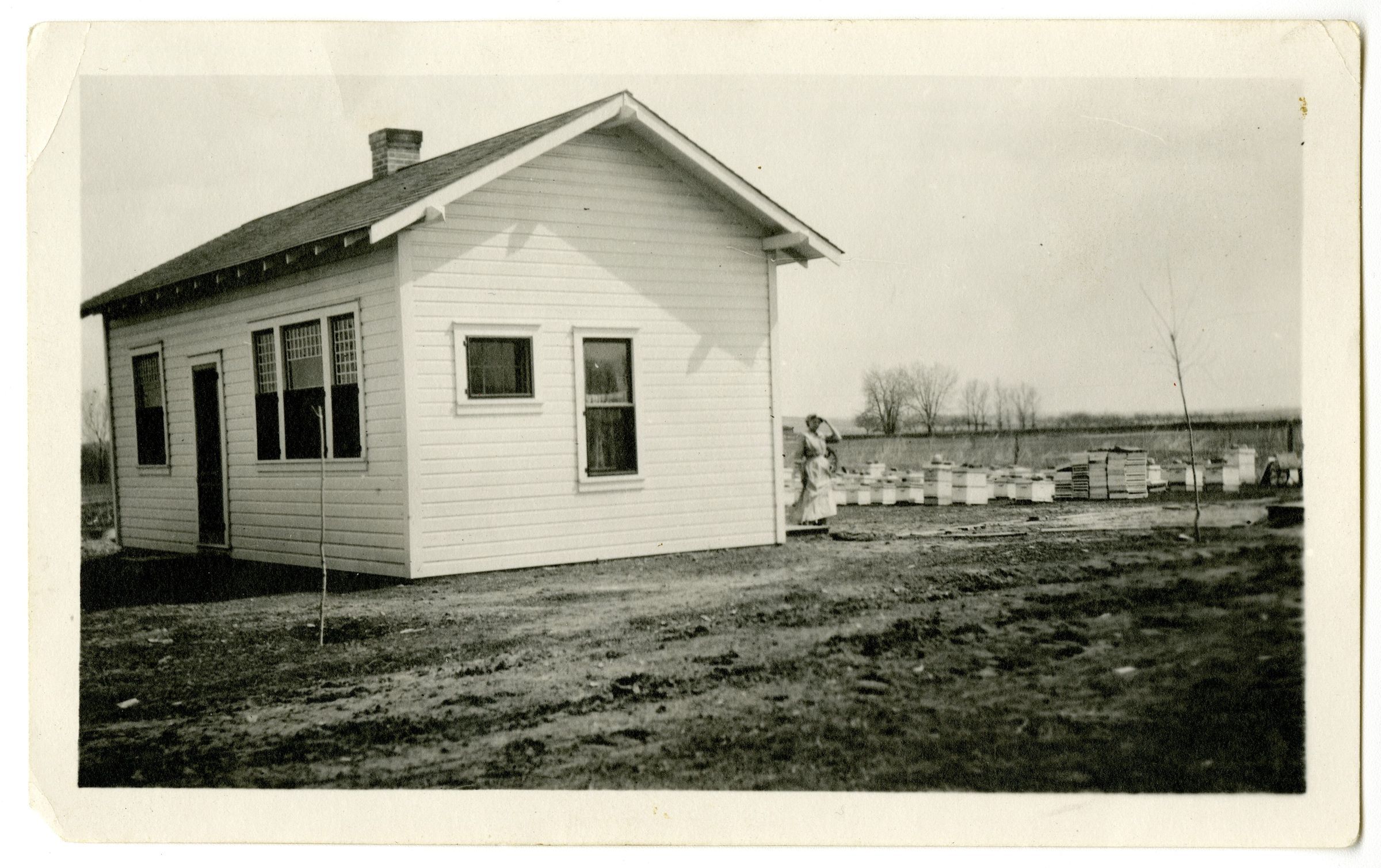 Crawford Honey House at original location with an unidentified woman (possibly Ada Crawford) and bee boxes behind building. Looking SE. B&W photograph. Original