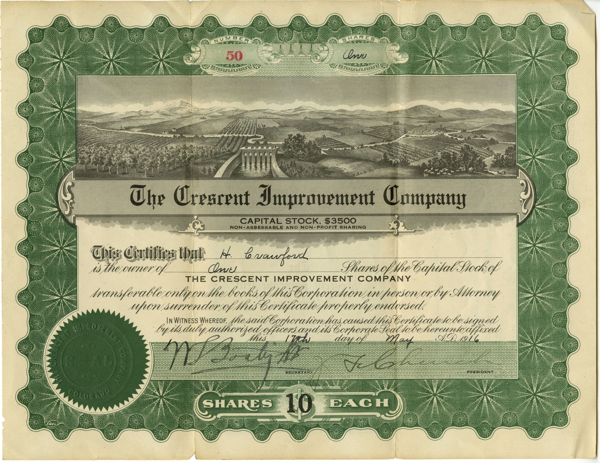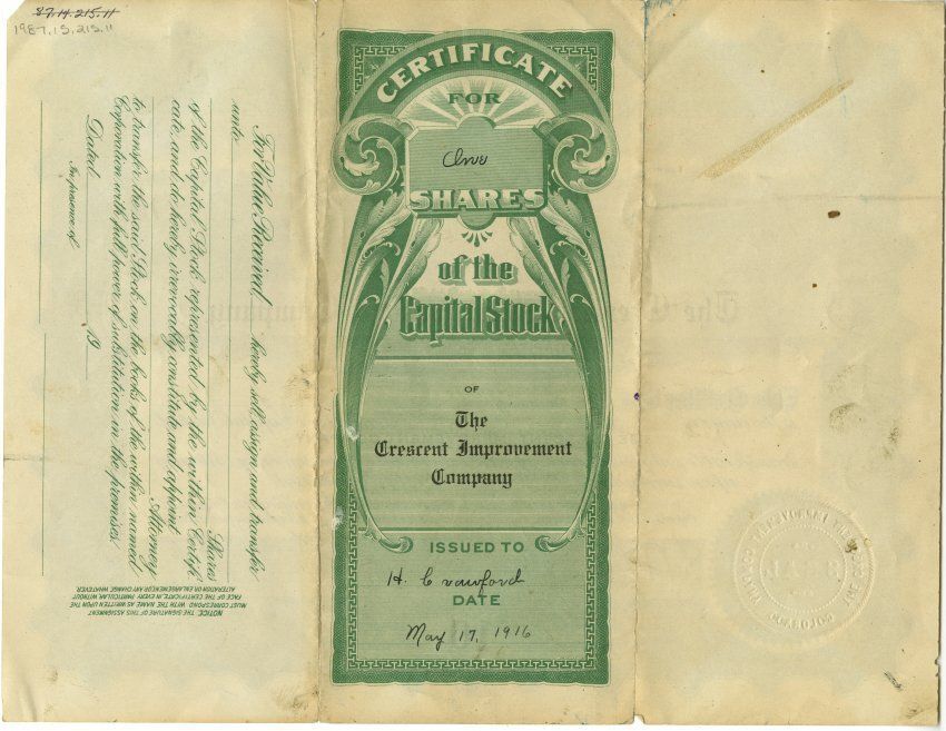 The Crescent Improvement Company Capital Stock, $3500. This certifies that H. Crawford is the owner of One Shares of the Capitol Stock of the Crescent Improvement Company. Green ink.