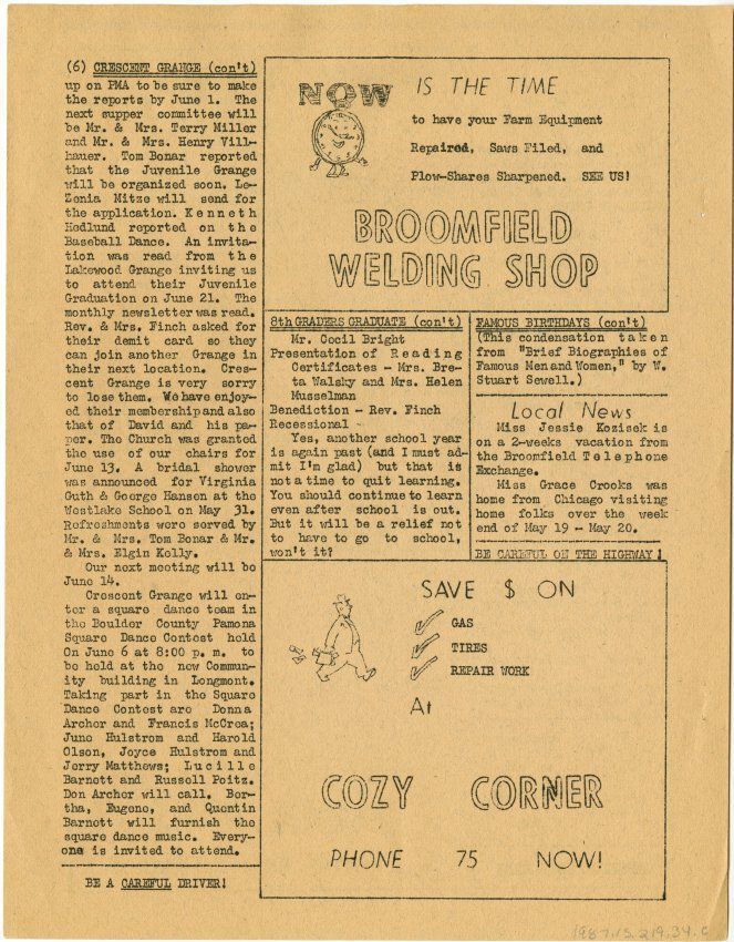 "The Broomfield Journal" 3 printed newsletters giving updates on local news. Includes ads, grange news, famous birthdays, and local sports.