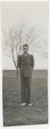 Black and white photograph of a young man in the yard of the Brunner farmhouse. The Brunner farm is in the background. The young man is dressed in dark pants, a dark shirt, a dark jacket, and white shoes. The young man is staring unsmiling at the camera. Photograph is of one of the three eldest sons of Lester C and Lib Brunner. Photograph was probably taken in the 1940s.Photograph Details