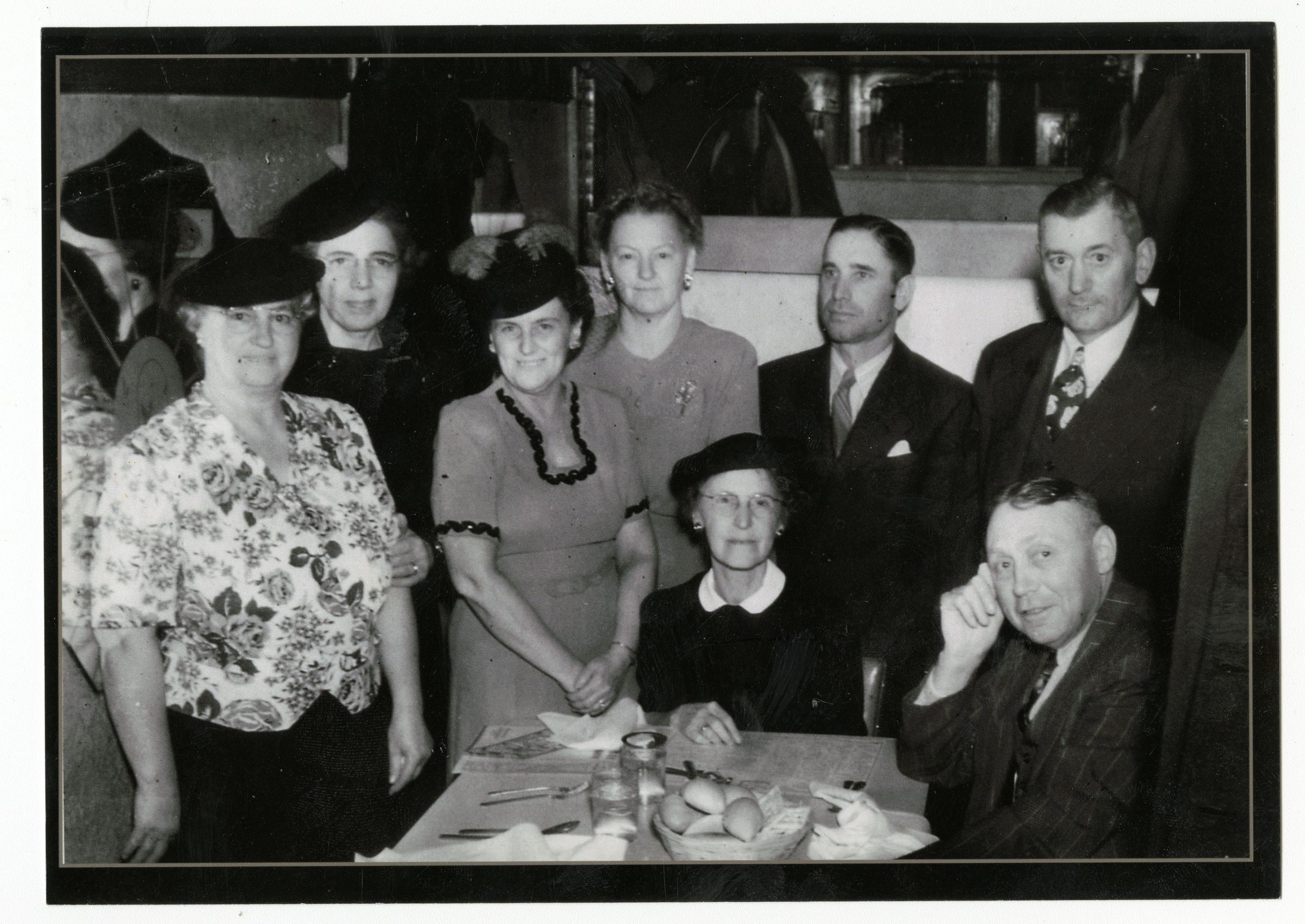 Black and white photograph of a group of people. From right to left they are John Anderson, Anne Anderson (with black piping), Katie Sneider in flowers, Lester C, and Lib Brunner. Lester C is 2nd to the right.