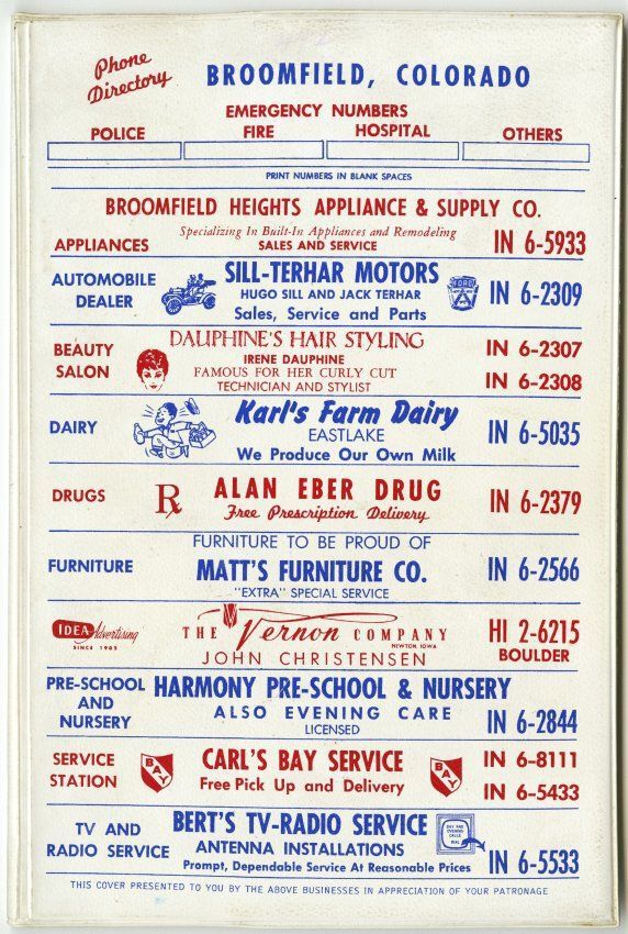 Broomfield, Colorado Telephone Directory. April 1962. Plastic cover with business details, businesses and community names, addresses, and phone numbers inside.